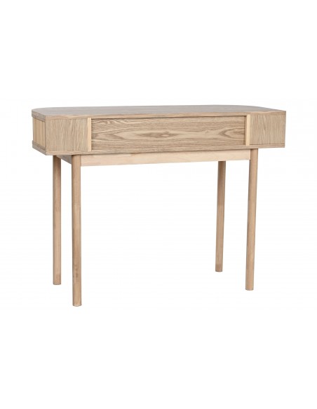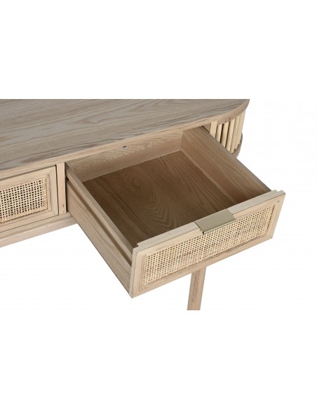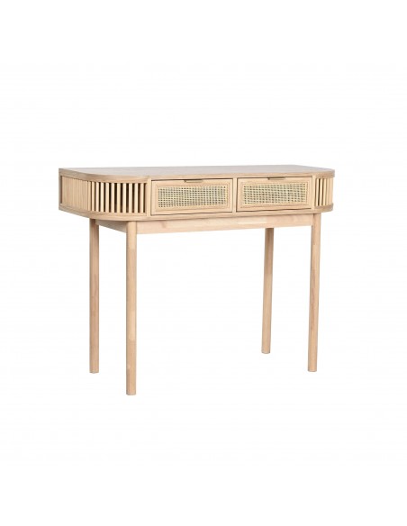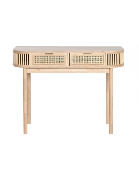 Esta elegante consola de madera combina la simplicidad del diseño nórdico con la calidez de los detalles en rejilla. Sus líneas limpias y su acabado en madera clara la convierten en una pieza versátil que puede usarse como mueble de entrada, tocador o escritorio pequeño.