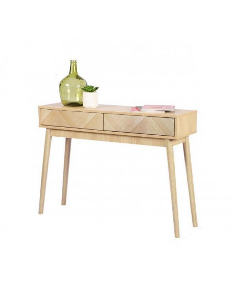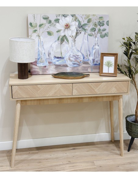 Muy práctica, dispone de dos cajones con un diseño frontal de líneas. De estilo nórdico con líneas muy rectas y cuenta con cuatro patas ligeramente inclinadas.