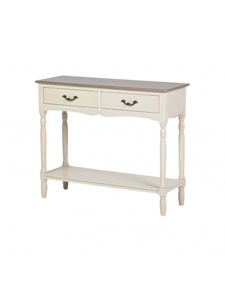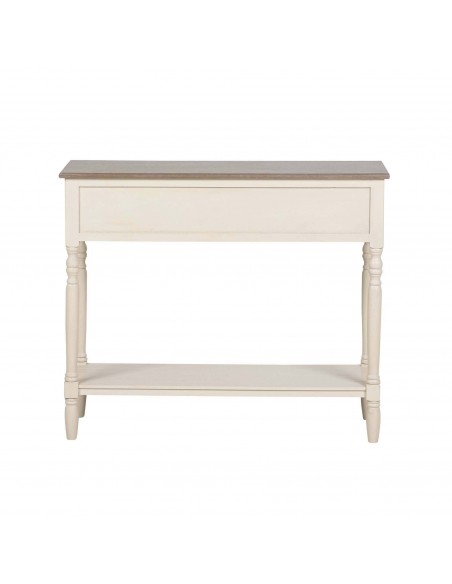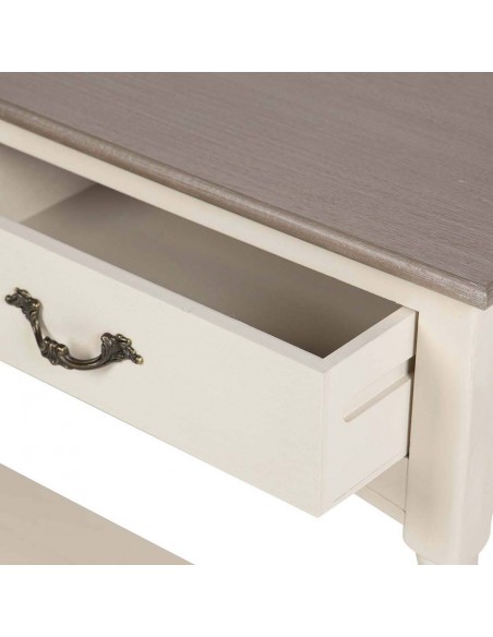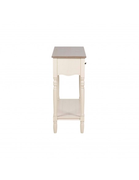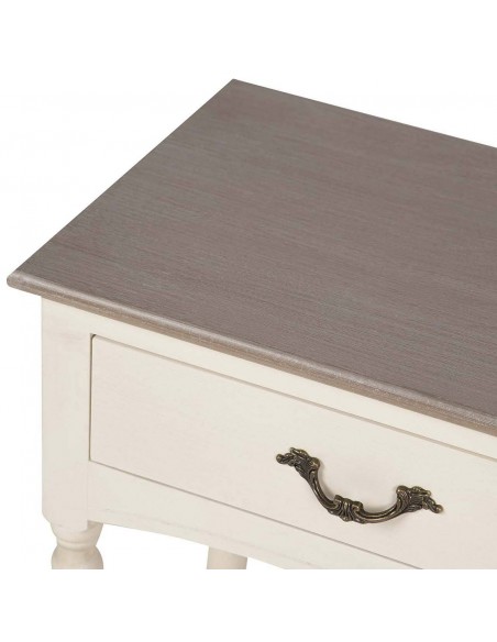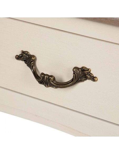 Un mueble práctico y con mucho encanto, elaborado en madera de pino y tablero de MDF. Su diseño y los tiradores metálicos envejecidos le dan un aire elegante y atemporal.