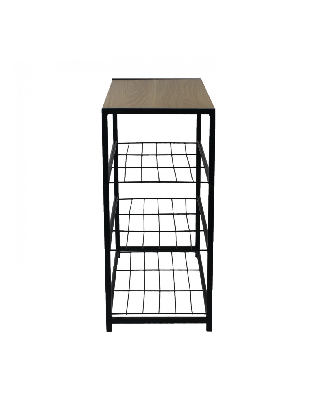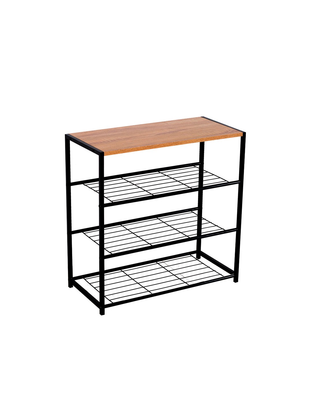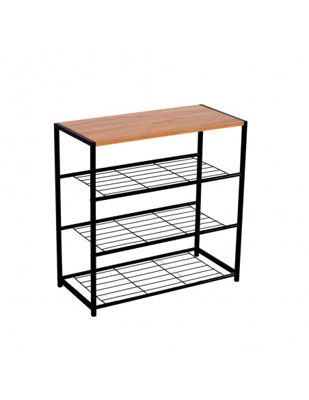 Práctica estantería zapatero metálica negra con tres baldas del mismo material y una cuarta de madera MDF en su parte superior, perfecta para poner en el recibidor o los pies de la cama.