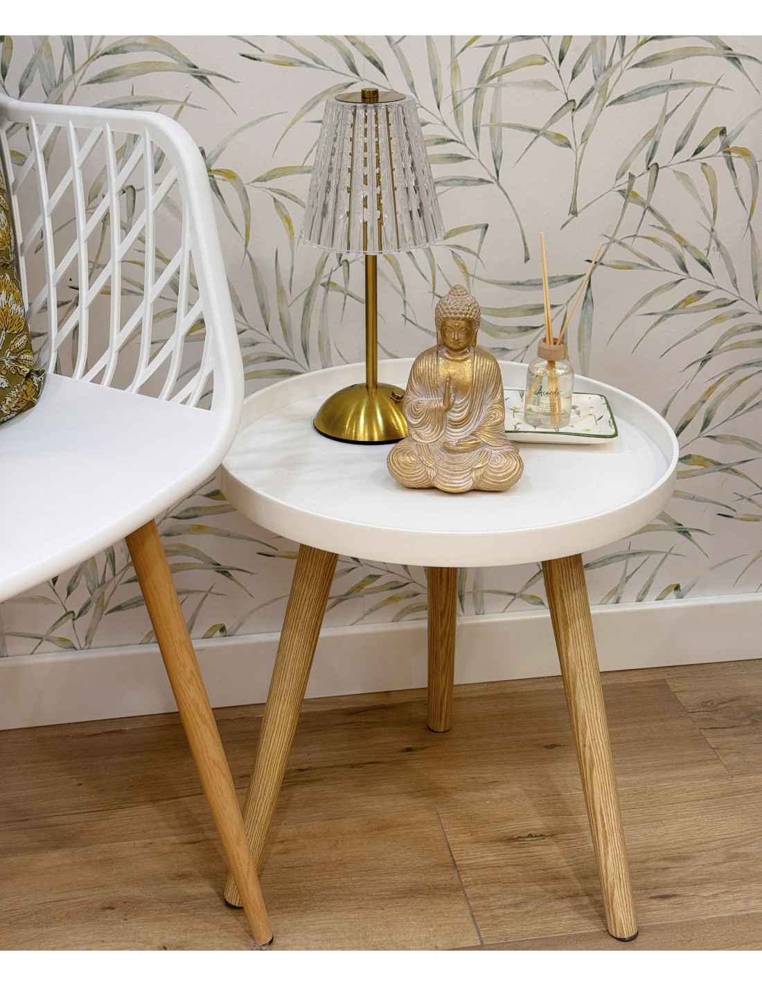 Elegante mesa auxiliar con encimera de PVC blanco y las patas de madera inclinadas en tono natural.