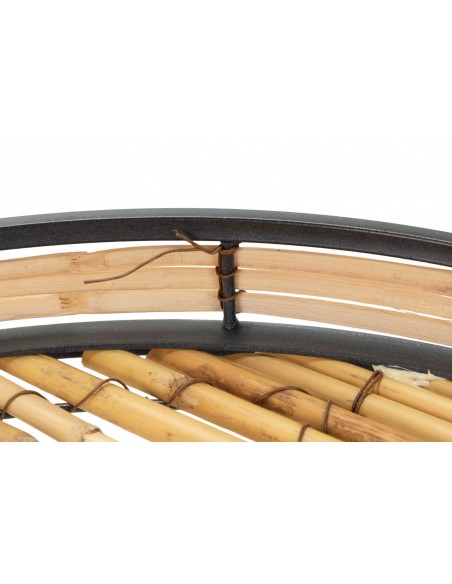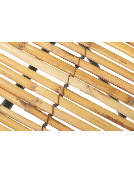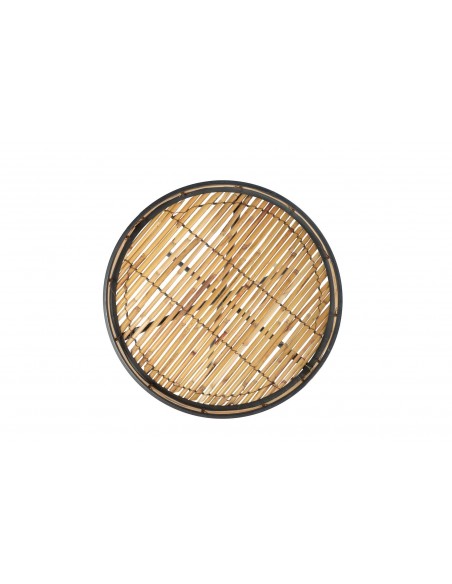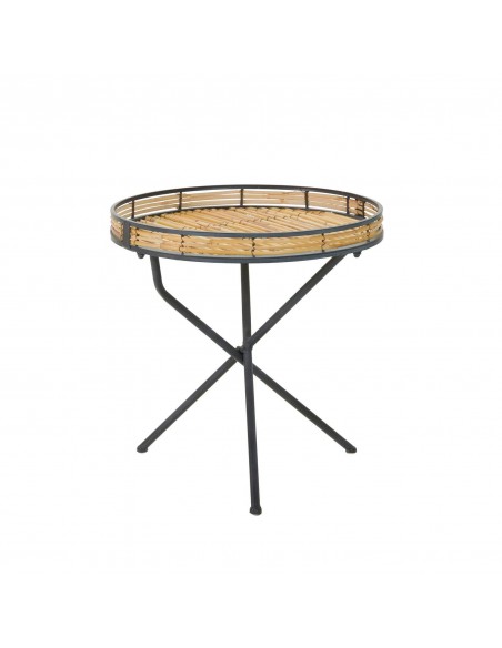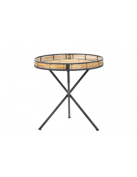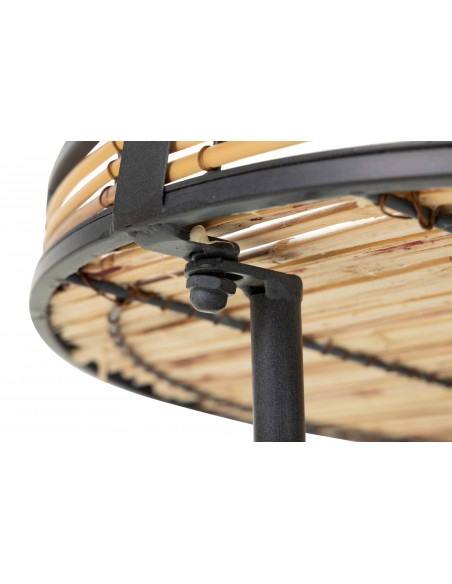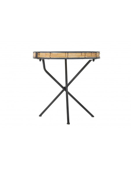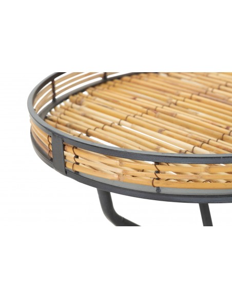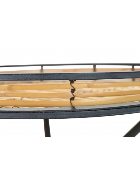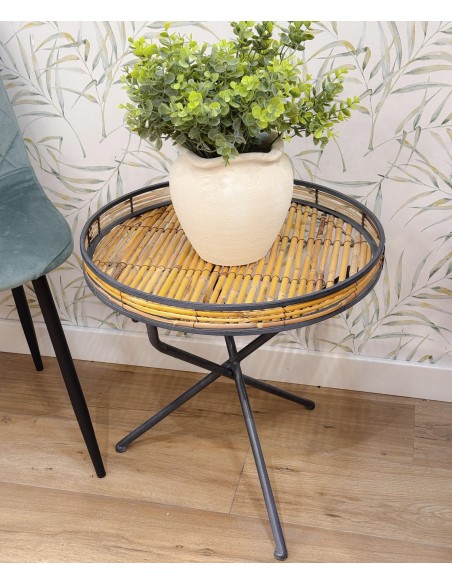 Esta mesa auxiliar combina una estructura gris azulada con una base redonda de bambú trenzado, aportando calidez y ligereza visual.