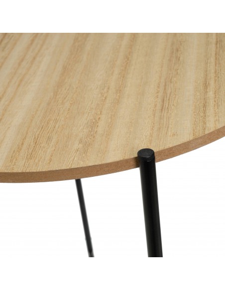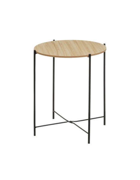 Diseño sencillo y moderno con base redonda en acabado madera clara y patas finas negras.