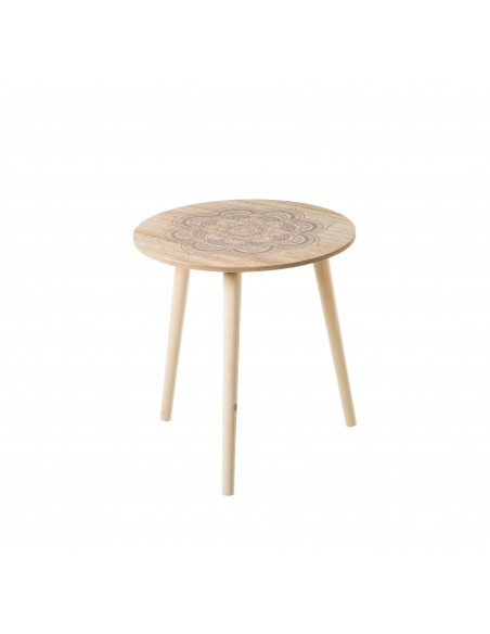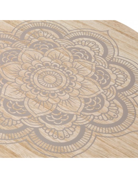 Dale un toque bohemio y natural a tu hogar con esta preciosa mesa auxiliar de madera. Su diseño minimalista con patas finas y un elegante grabado de mandala en la superficie la convierte en una pieza única. Ideal para usar como mesita de noche, mesa auxiliar en el salón o como soporte decorativo.