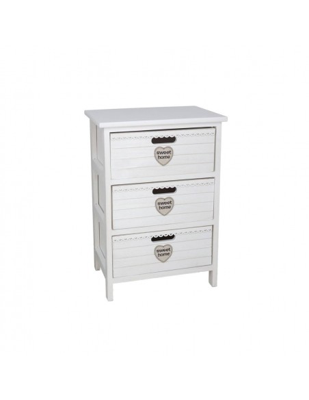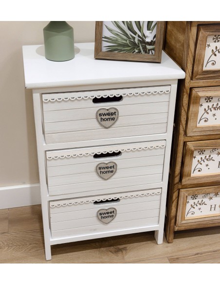 Con un acabado blanco elegante y tres cajones espaciosos, cada uno con un detalle de corazón y la inscripción "sweet home", esta mesita no solo ofrece almacenamiento, sino que también decora con estilo.
