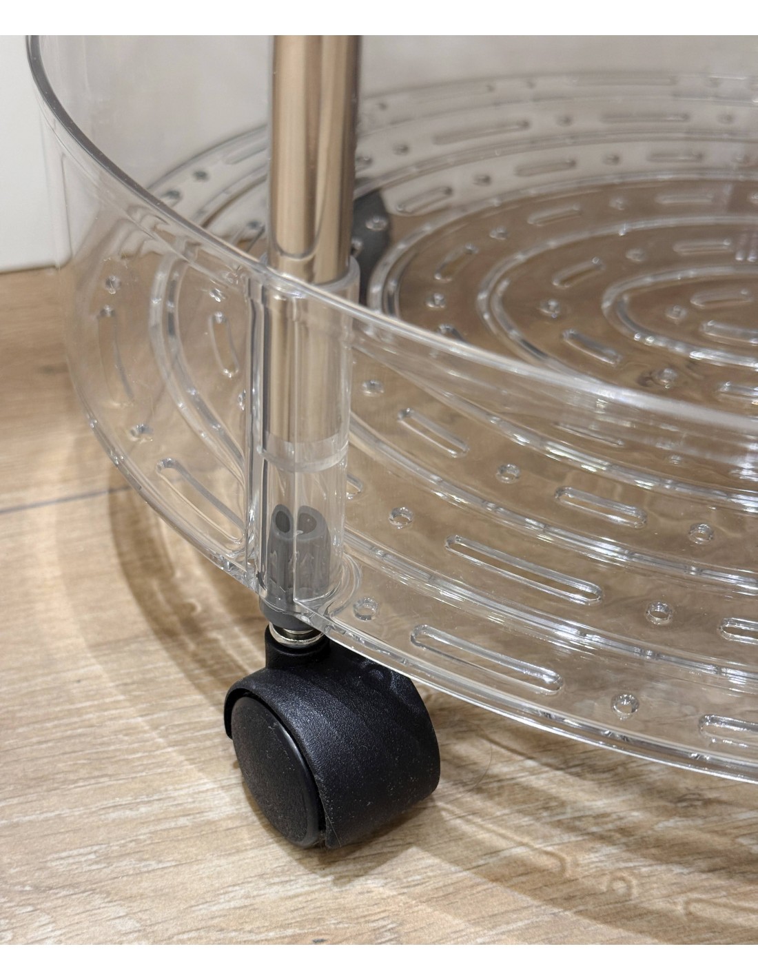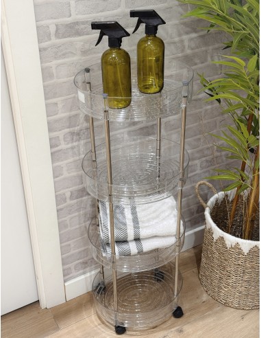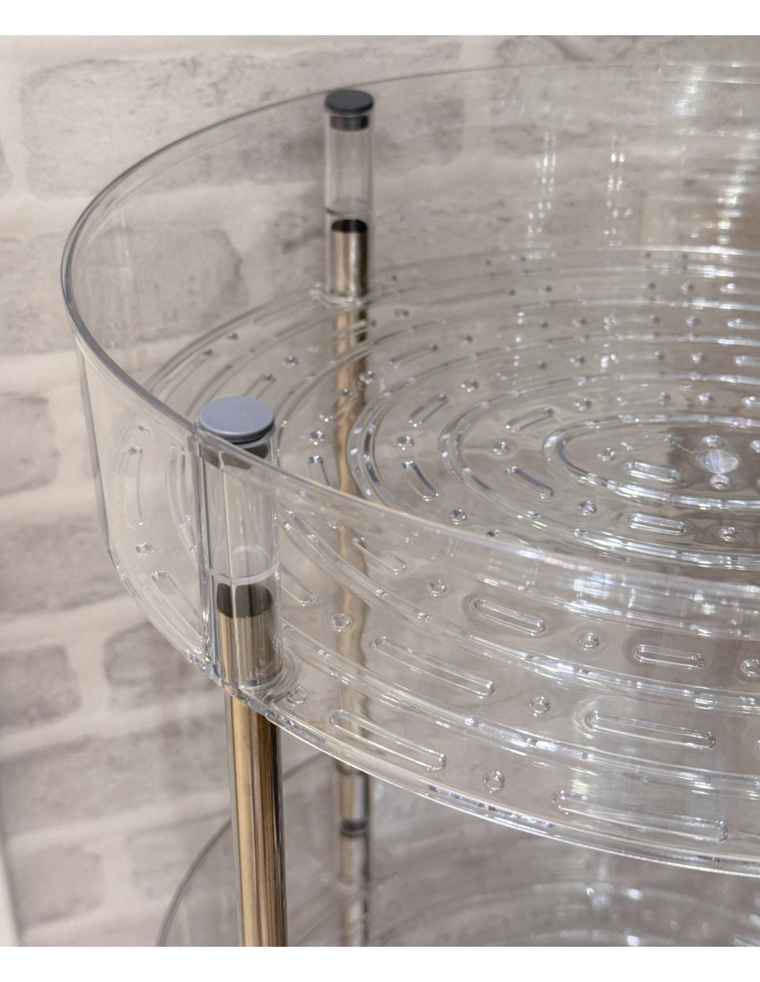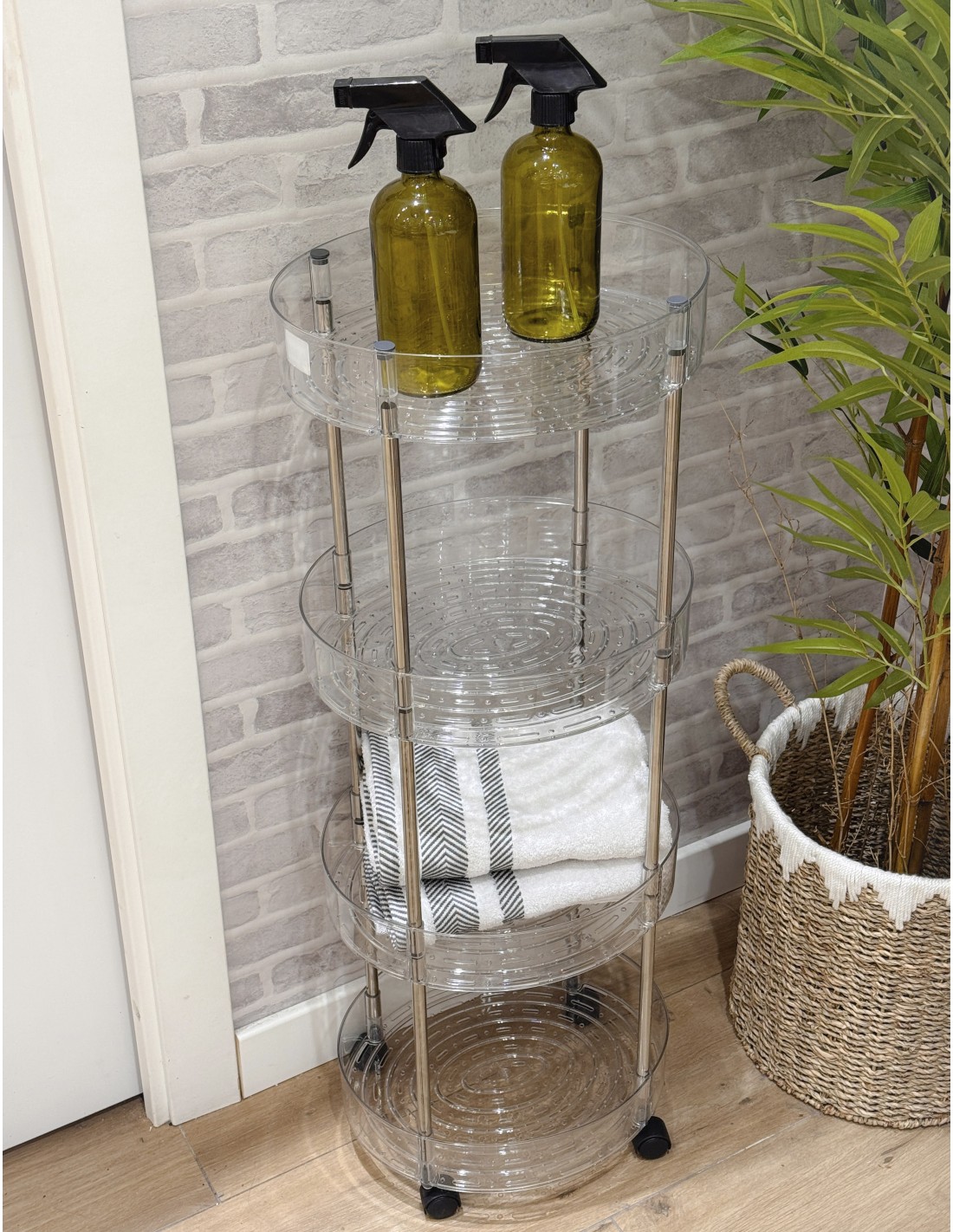 Carrito organizador de cuatro niveles con estructura transparente, acabado brillante y ruedas giratorias. Las baldas cuentan con borde elevado que mantiene los objetos bien sujetos, ideal para espacios que necesitan orden sin perder ligereza visual.