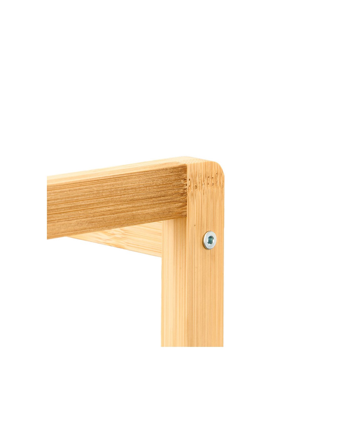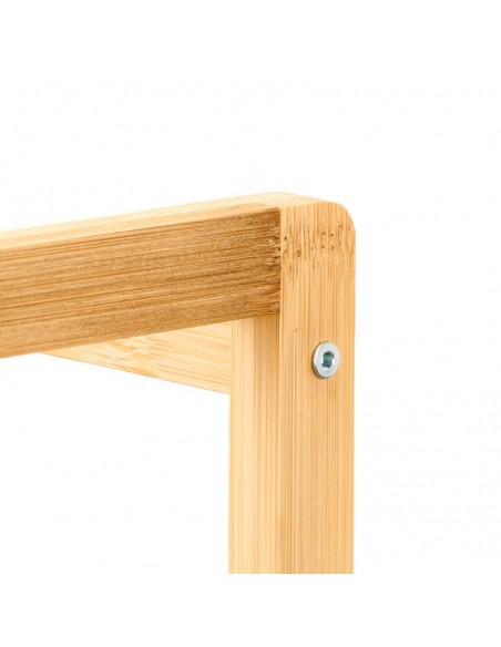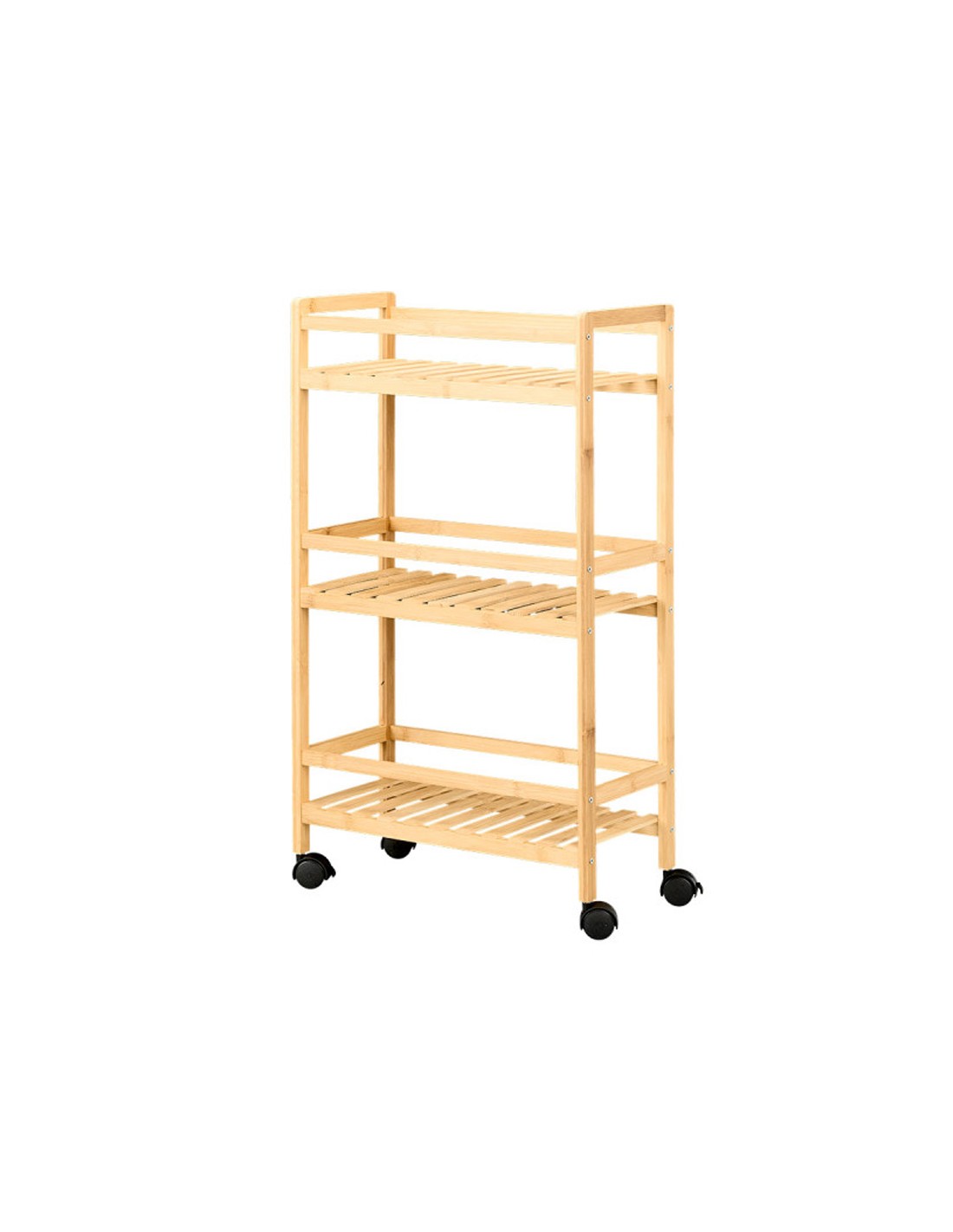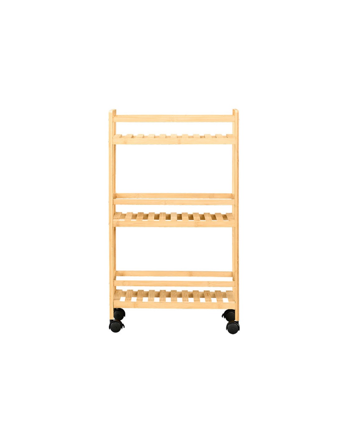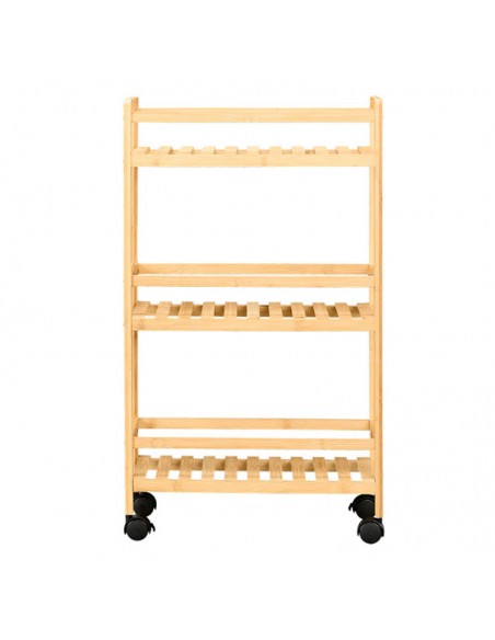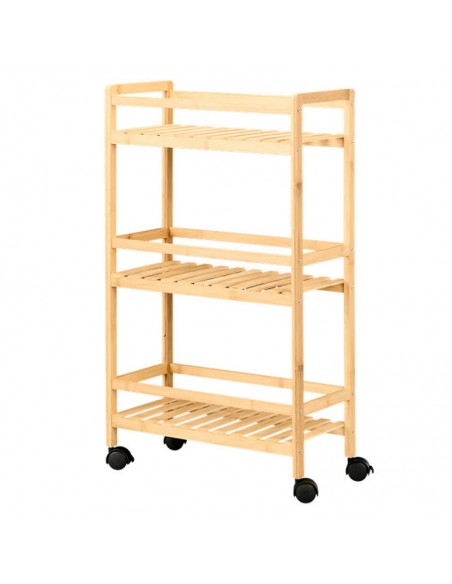 igera y práctica estantería de bambú natural con tres baldas de lamas y ruedas giratorias para moverla fácilmente de un espacio a otro.