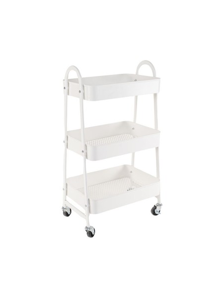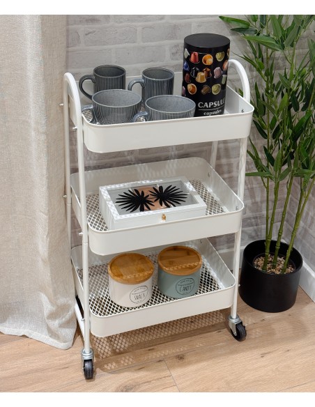 Está fabricado en metal y está lacado en color blanco. Tiene tres bandejas que puedes usar como frutero en la cocina o para el maquillaje en el baño, gracias a sus cuatro ruedas podrás moverlo a donde quieras.
