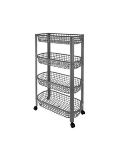 Práctico carrito organizador de plástico en color gris, con estructura ligera y resistente. Cuenta con cuatro cestas tipo rejilla que permiten la ventilación y ruedas giratorias para moverlo cómodamente.