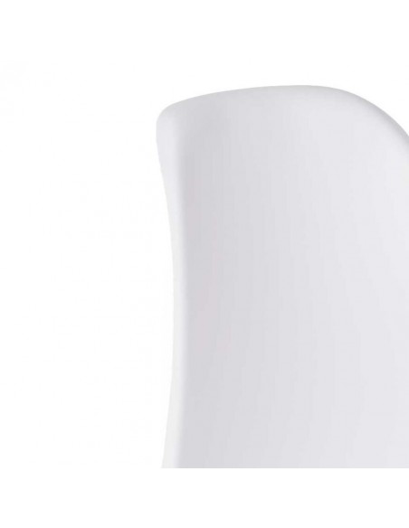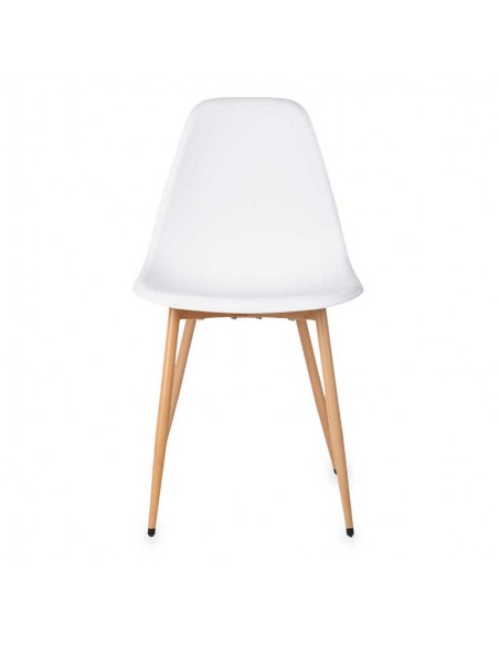 Sencilla silla de PVC en color blanca con patas de metal que imita la madera para dar un toque más cálido a la estancia.