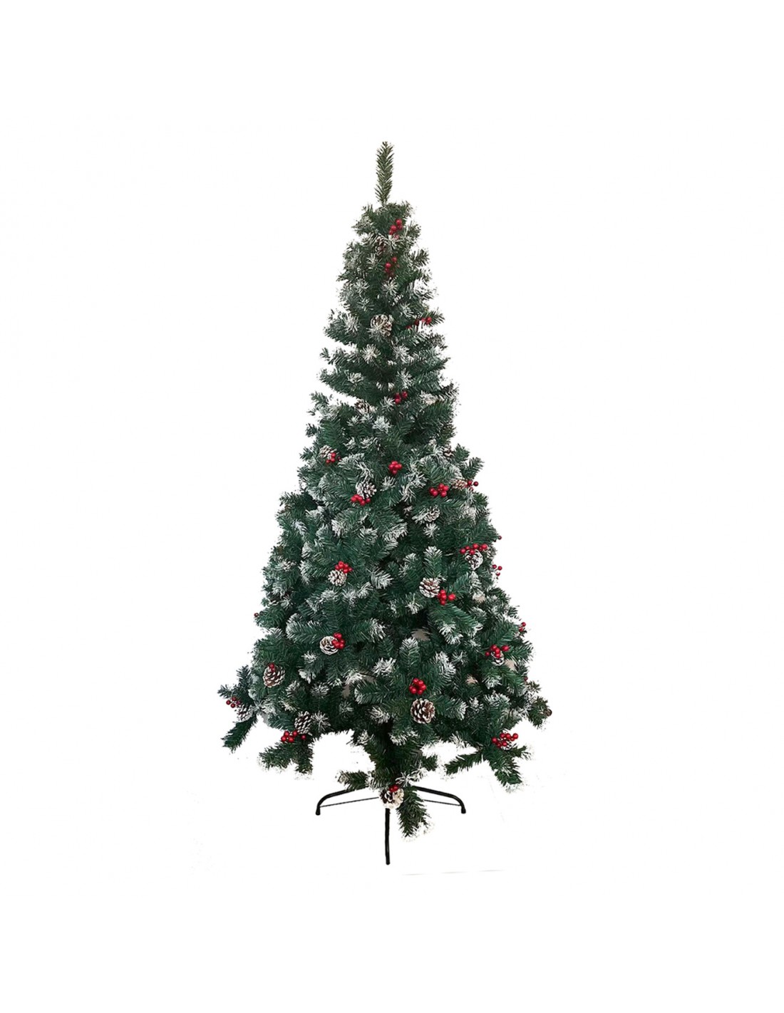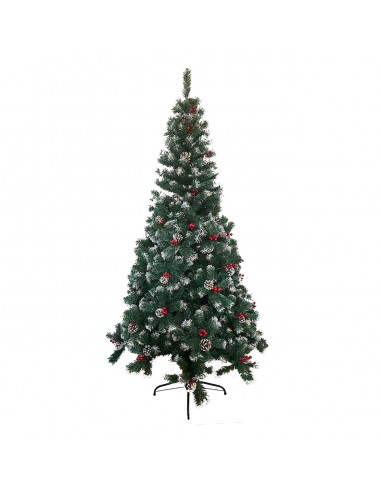 Árbol de Navidad artficial verde fabricado en resistente PVC con efecto nevado y decorado con piñas y bayas rojas.
