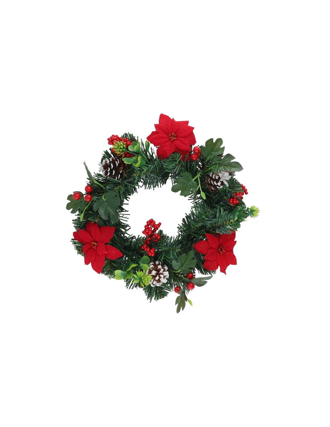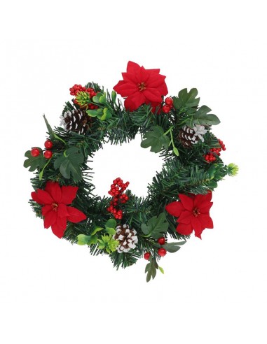 Bonita corona decorativa de estilo navideño, con flores de tela roja, piñas nevadas y detalles en verde y rojo que evocan el espíritu de la Navidad.