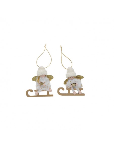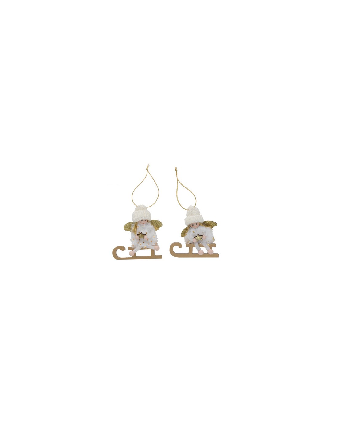 Tierno adorno navideño de ángel con alas doradas, gorro de punto y estrella en las manos, sentado sobre un trineo de madera, ideal para colgar en el árbol o decorar cualquier rincón con encanto invernal.