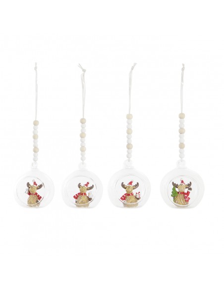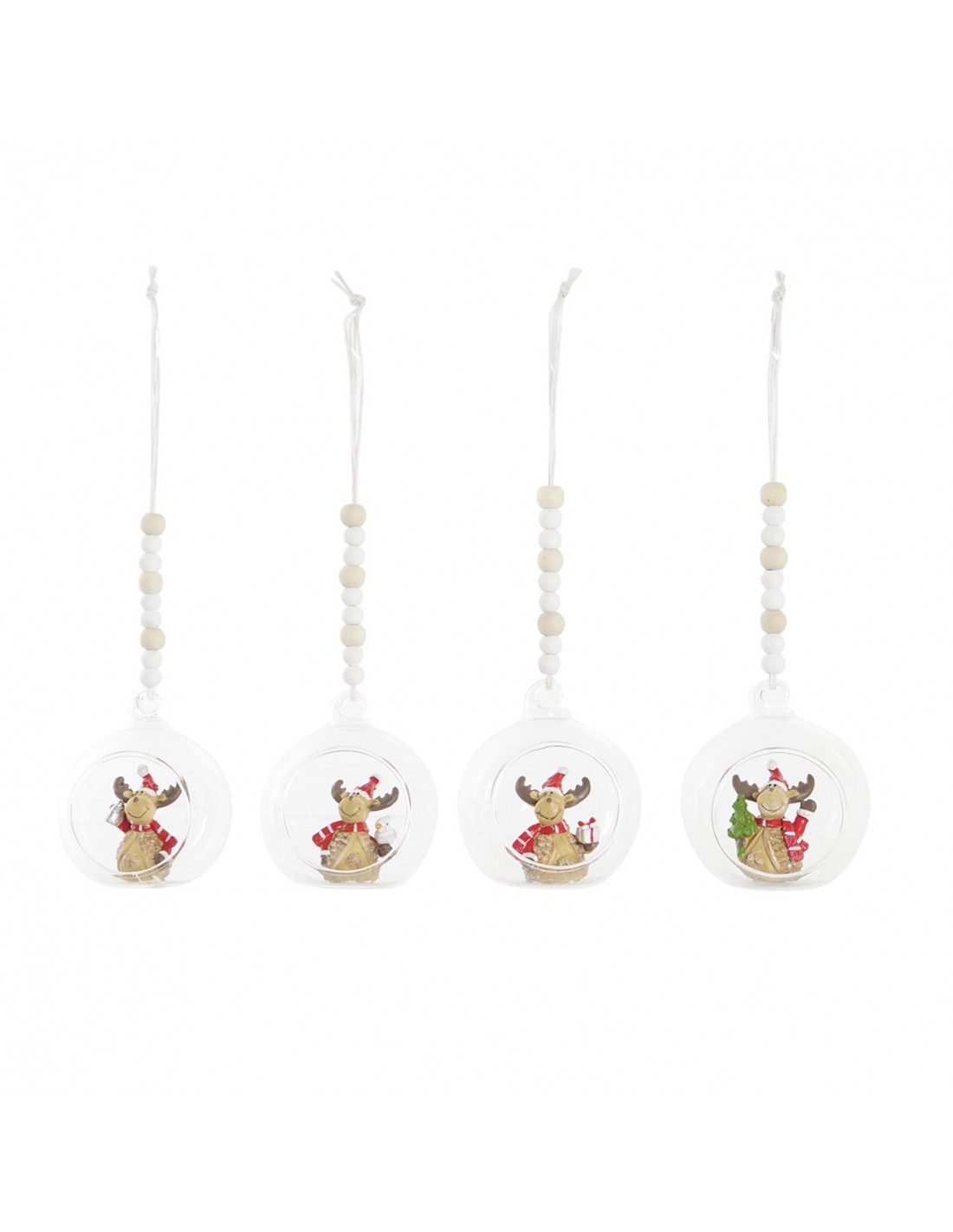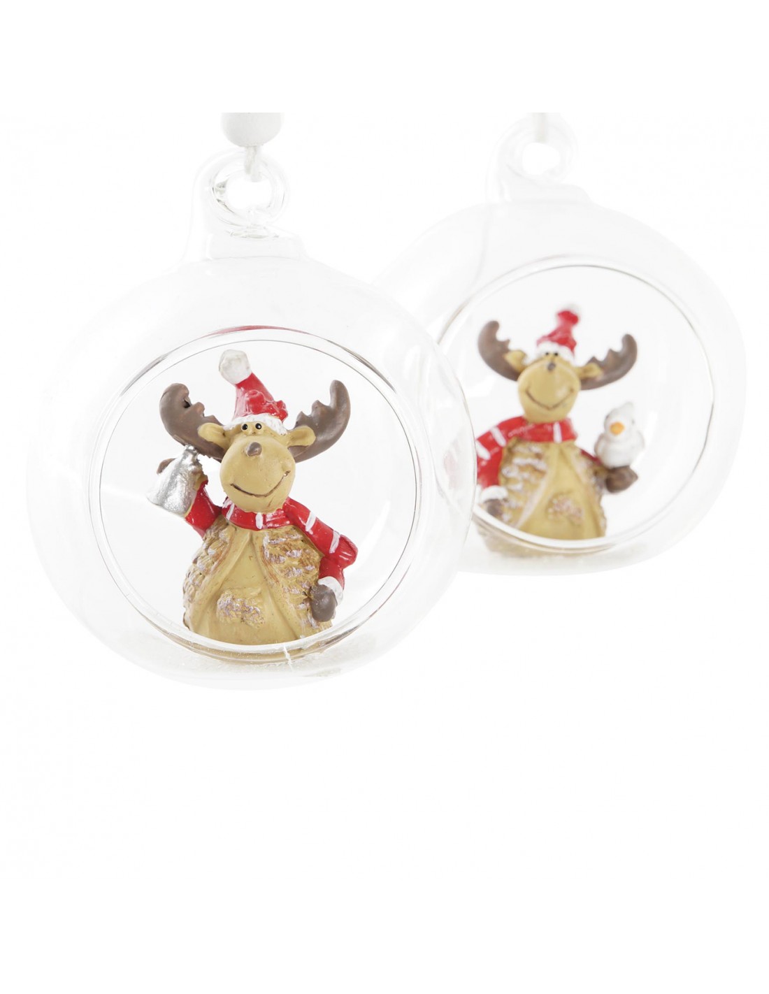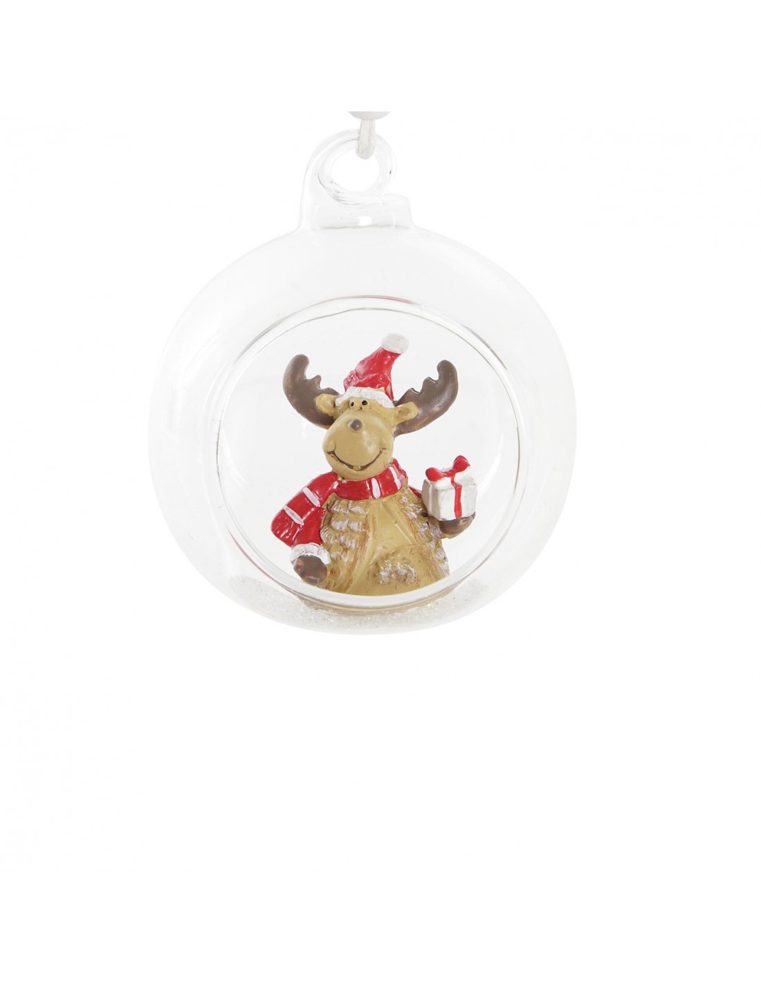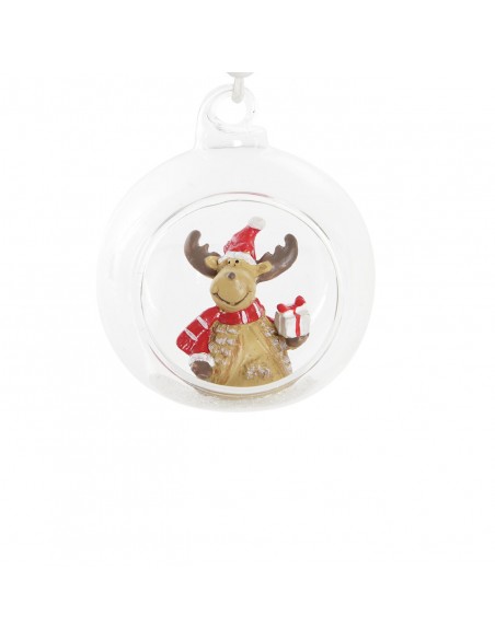 Bola colgante transparente con figura de reno de resina en el interior y detalle de cuentas decorativas en el colgador.
