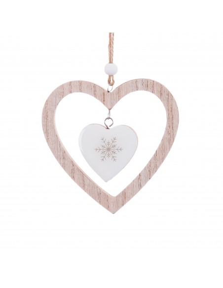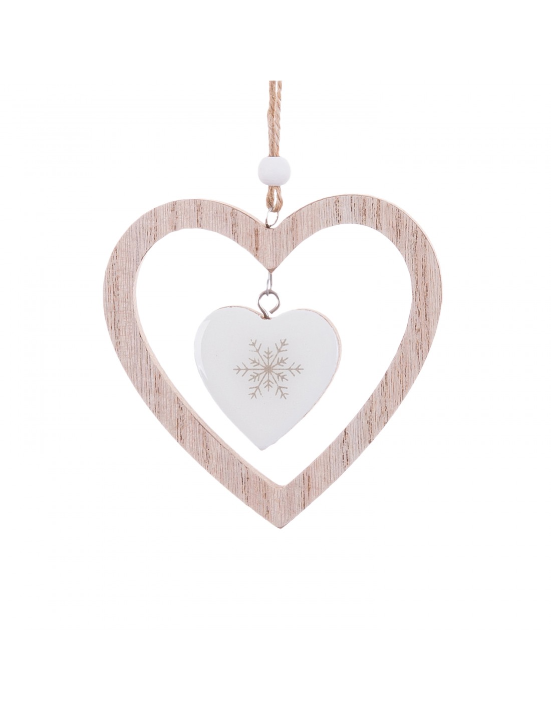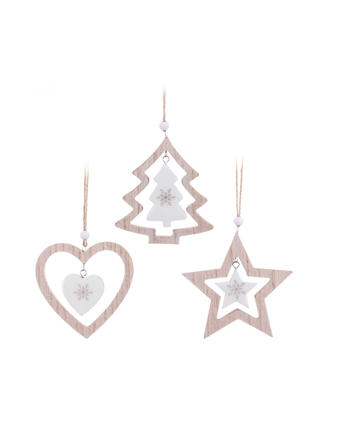 Adorno navideño colgante con forma de corazón, estrella o árbol, en madera natural y detalles blancos con copo de nieve.