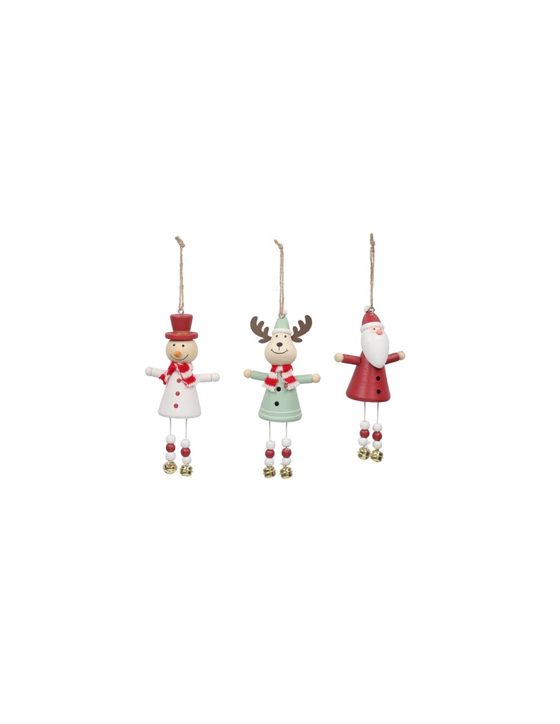 Simpático adorno navideño colgante fabricado en madera, con forma de muñeco de nieve, reno o Papá Noel.
