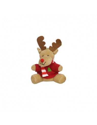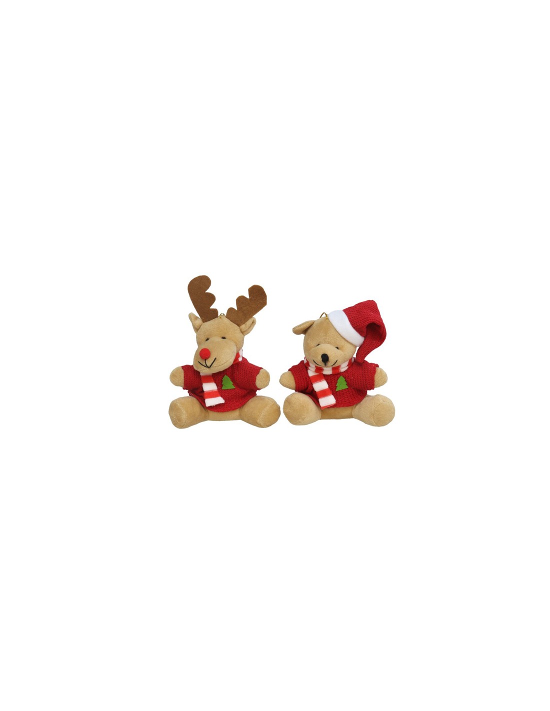 Divertidos adornos navideños en forma de peluche, con diseño de reno y osito vestidos con jersey rojo, bufanda y detalles bordados.