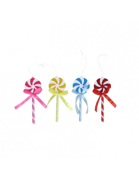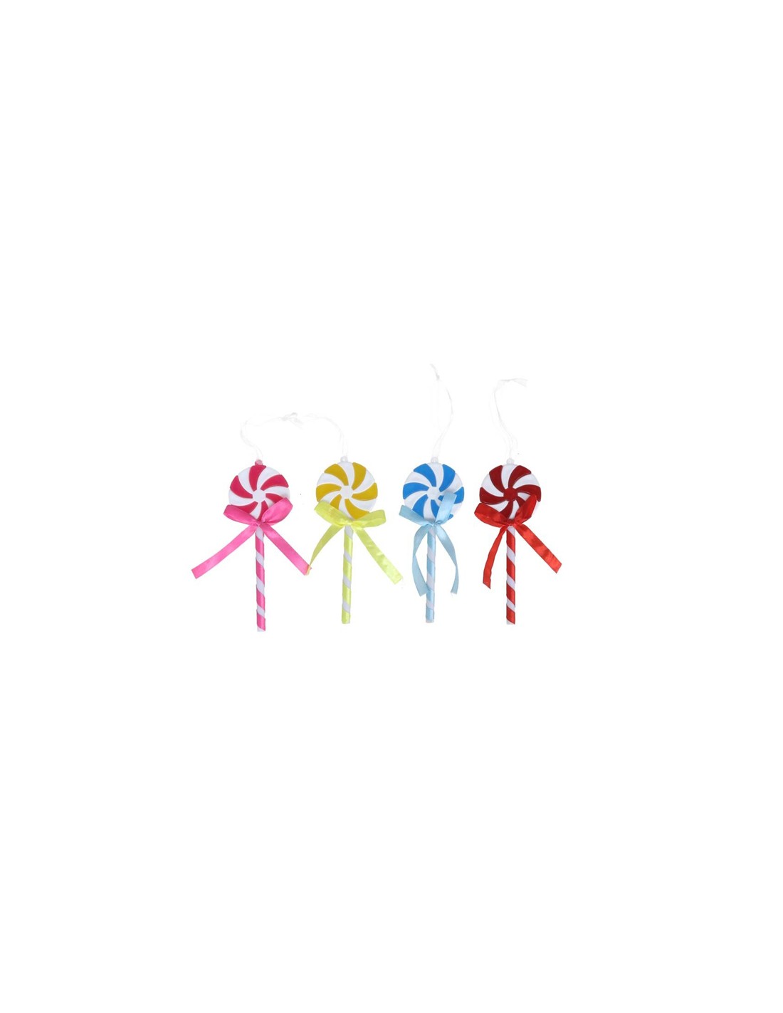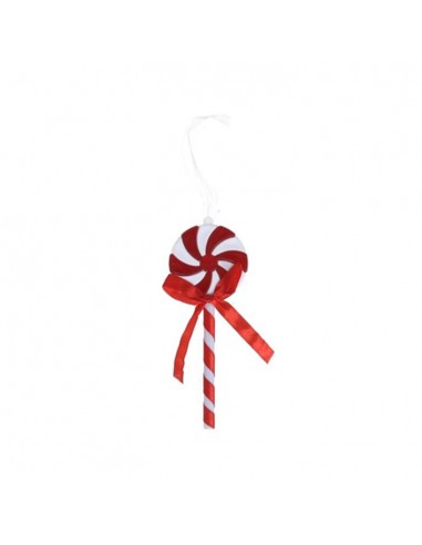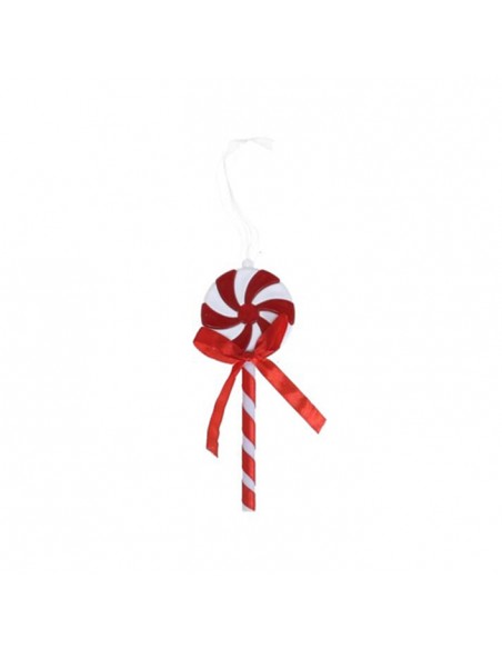 Divertido adorno colgante con forma de piruleta rayada, decorado con un lazo a juego y palito en espiral.