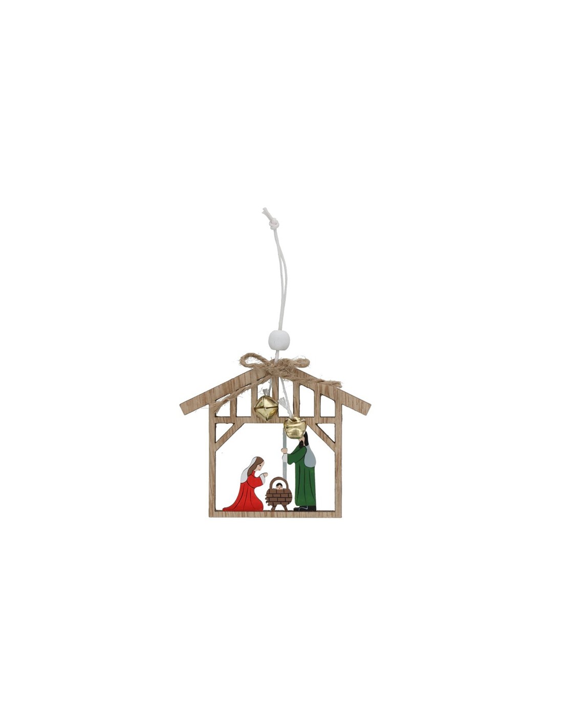 Adorno navideño en forma de portal de Belén, hecho de madera con figuras pintadas y cascabeles dorados, ideal para colgar en el árbol o decorar cualquier rincón con un toque tradicional y entrañable.
