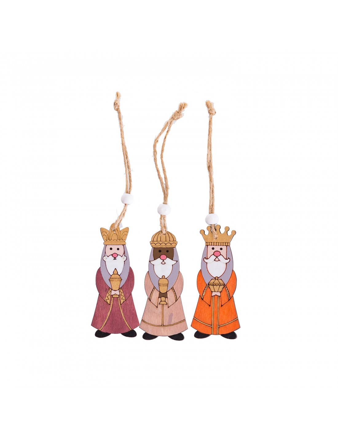Set de 3 adornos colgantes en madera con figuras de los Reyes Magos, decorados en colores cálidos y con cuerda rústica para colgar.