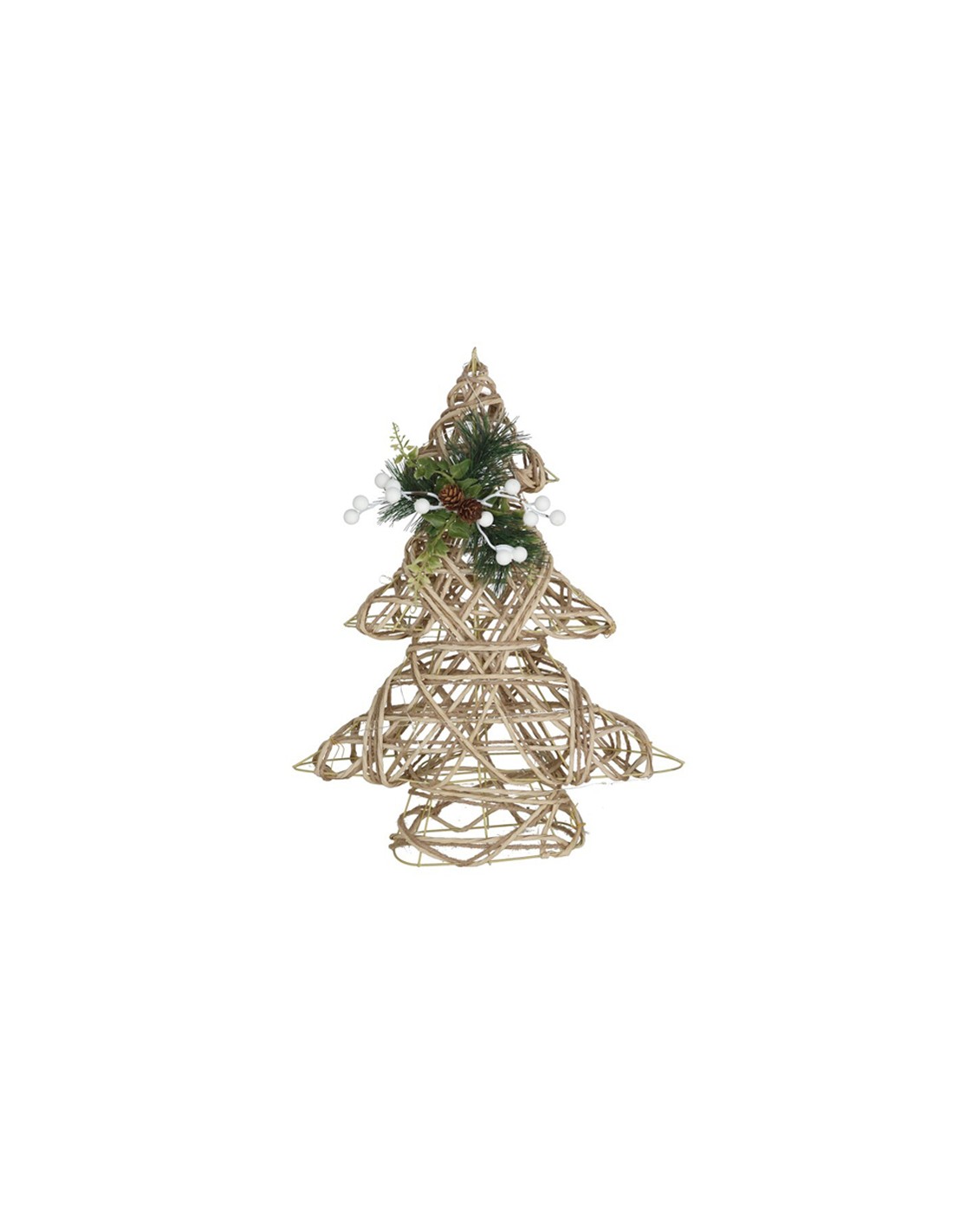 Árbol decorativo con estructura rústica y detalles de piñas, ramas verdes y bolitas blancas, ideal para dar un aire natural y festivo a la decoración navideña.