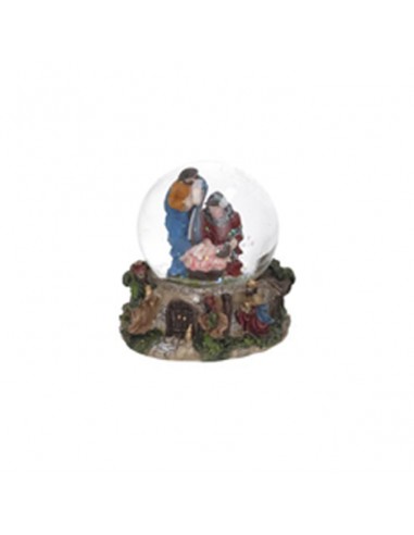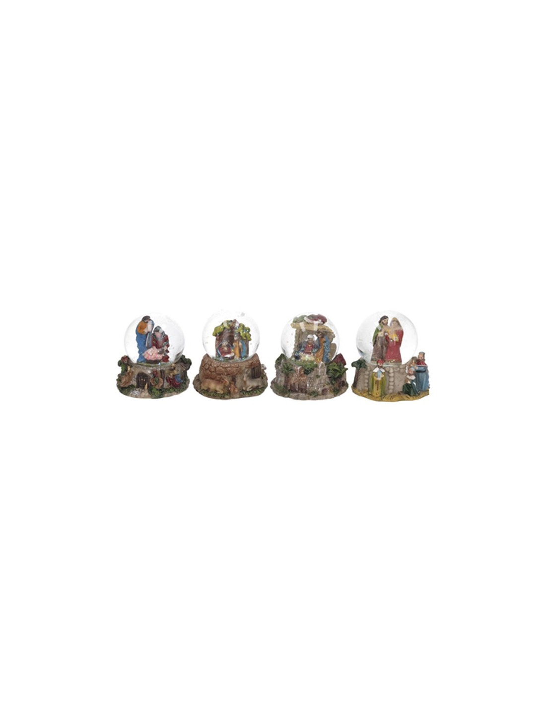 Encantadora bola de nieve con escenas del belén en miniatura y base decorada con detalles rústicos. Cada modelo representa un momento distinto del nacimiento, con figuras llenas de color y un efecto de nieve que se activa al agitarla.