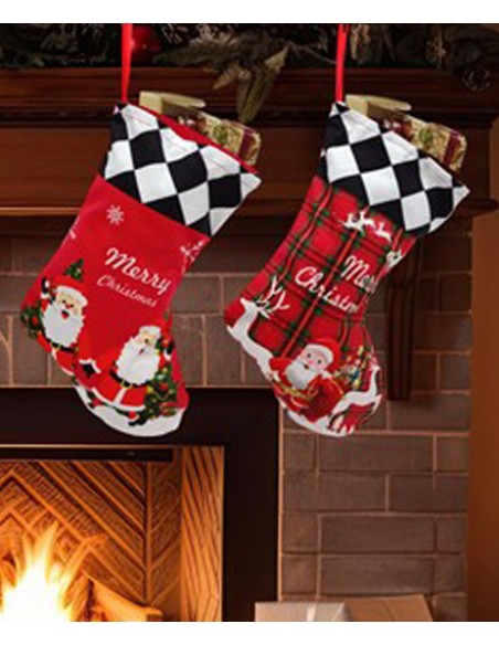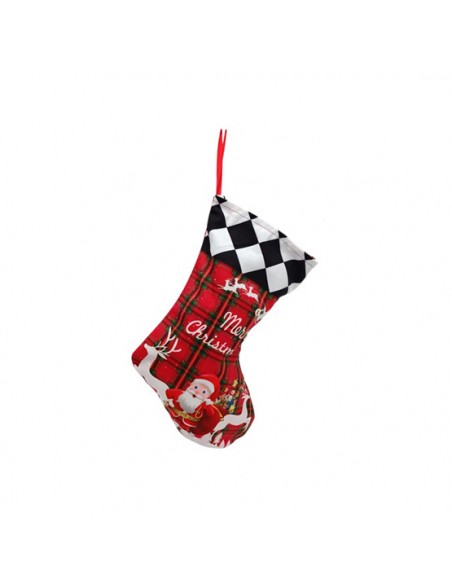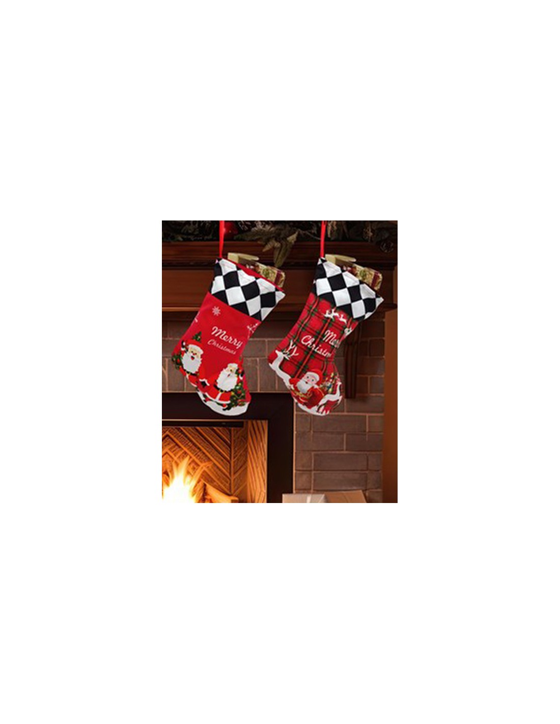 Bota decorativa de tela con estampados navideños de Papá Noel y borde superior con patrón de rombos en blanco y negro. Incluye cinta para colgar fácilmente.
