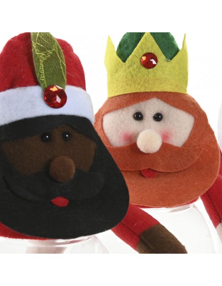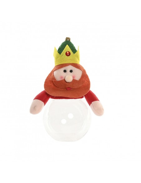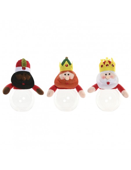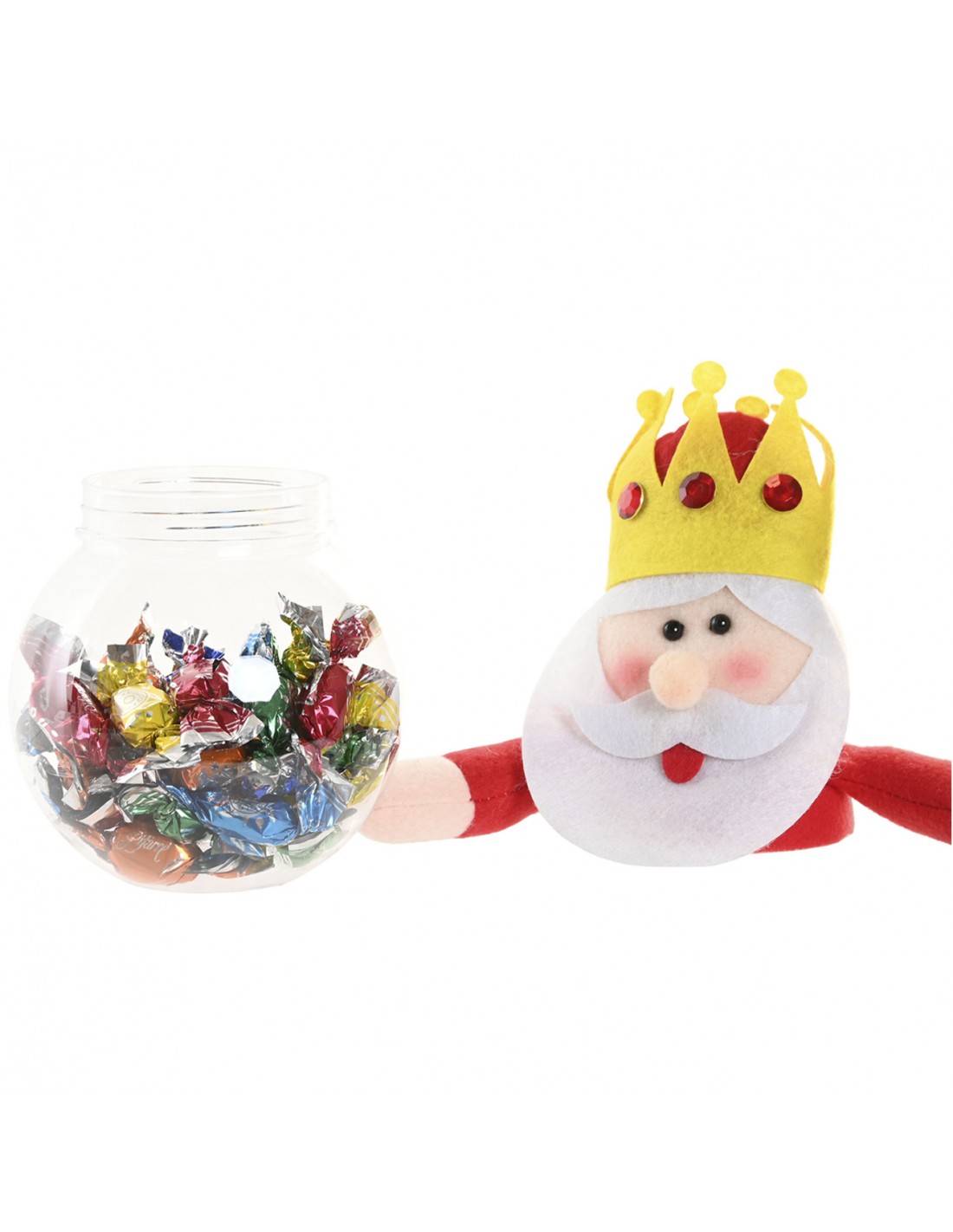 Bote navideño de plástico transparente con tapa decorada con figura de Rey Mago en peluche, ideal para guardar caramelos o pequeños detalles.