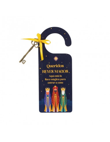 Original colgador navideño con diseño de los Reyes Magos con una pequeña llave metálica colgante atada con un lazo amarillo.