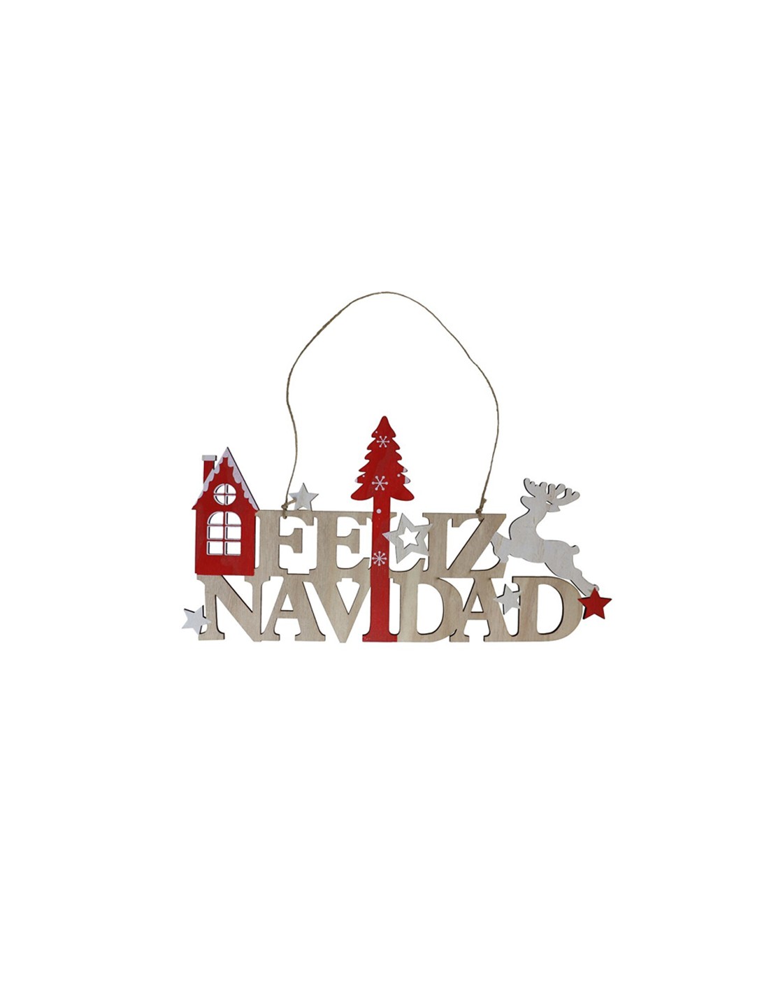 Cartel decorativo en madera con mensaje “Feliz Navidad”, detalles de casita, árbol, estrellas y un reno en tonos rojos y naturales. Ideal para colgar en puertas, paredes o ventanas y dar la bienvenida con espíritu navideño.