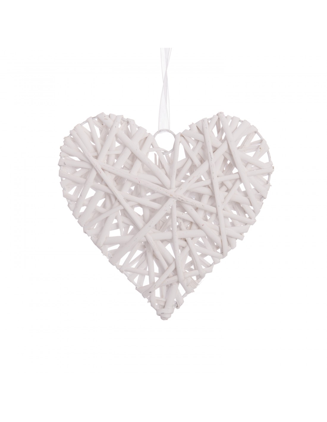 Corazón decorativo de mimbre blanco con diseño entrelazado y cinta para colgar.