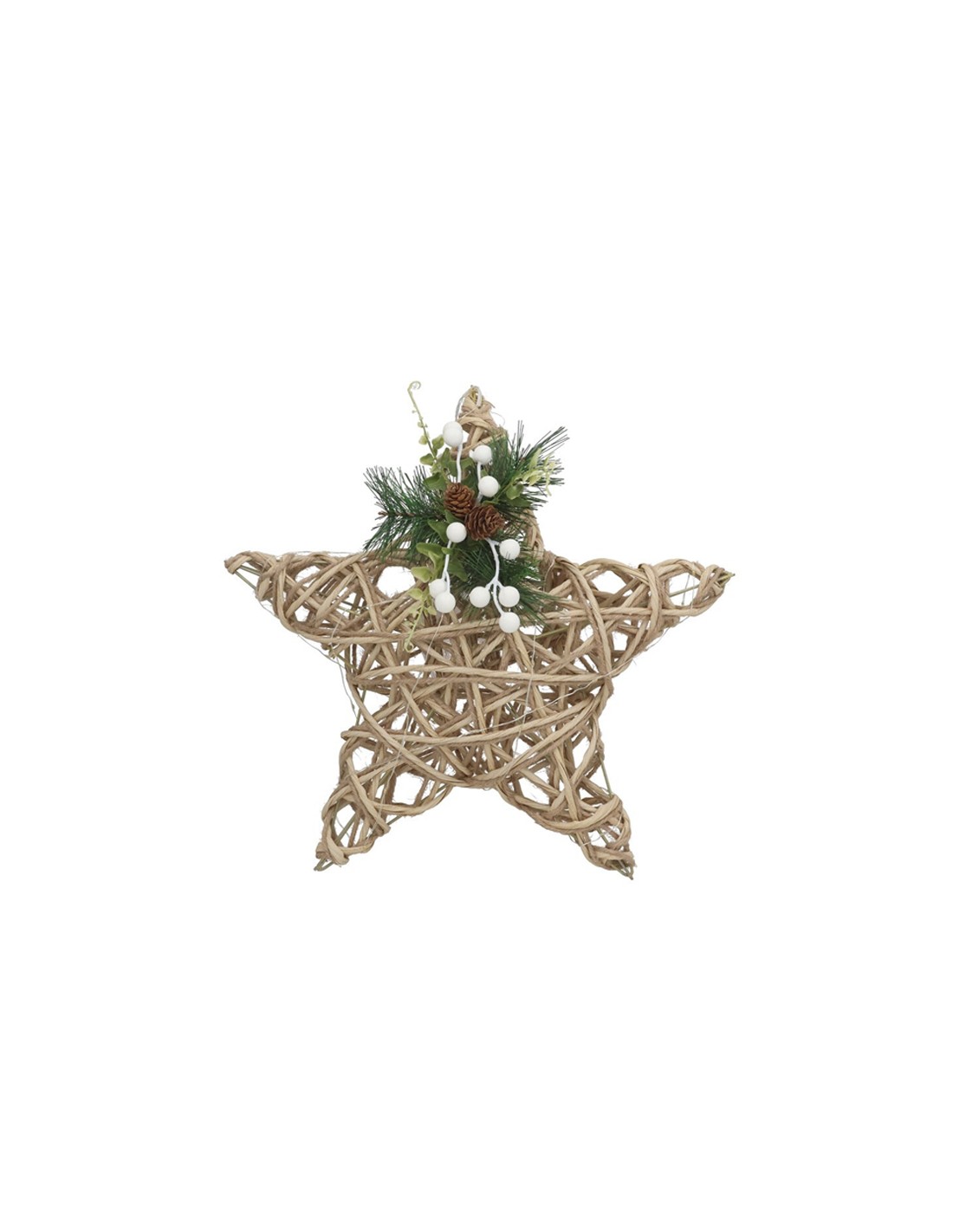 Estrella decorativa con diseño rústico, decorada con piñas, ramas verdes y bolitas blancas, perfecta para colgar o apoyar en la decoración navideña del hogar. Funciona con 3 pilas AA (no incluidas).