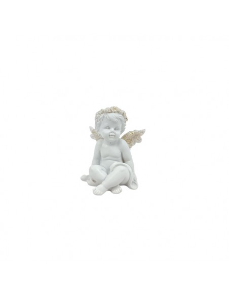 Adorable figura de ángel sentado con alas doradas brillantes y delicada corona floral.