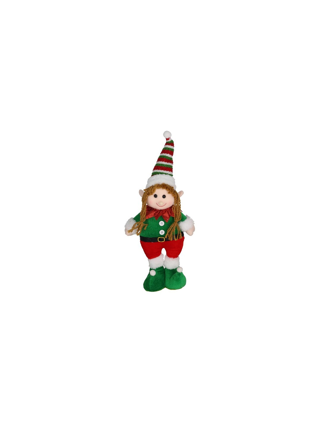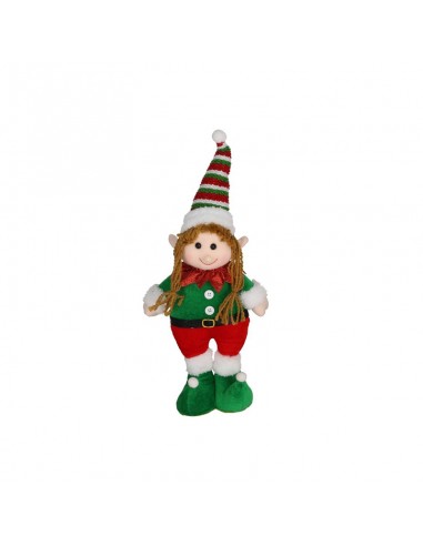 Simpático muñeco con forma de elfo, vestido con colores navideños y detalles como cuello brillante, gorro de rayas con pompón y orejitas puntiagudas.