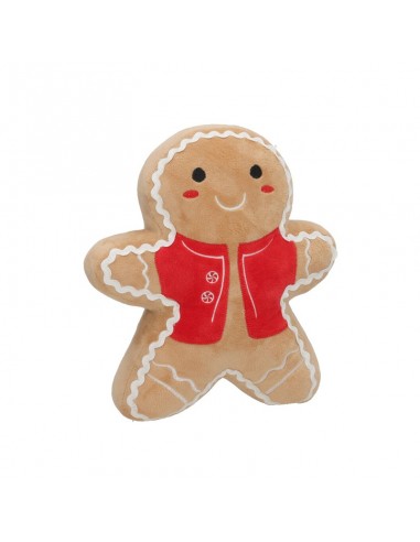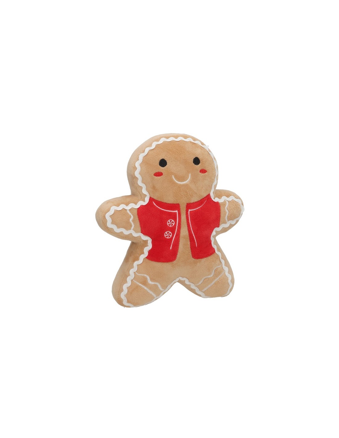 Divertido muñeco decorativo con forma de galleta de jengibre, realizado en tejido suave con detalles bordados y un simpático chaleco rojo.