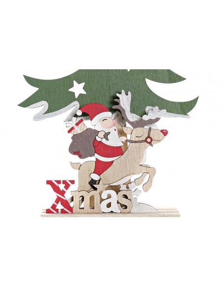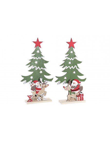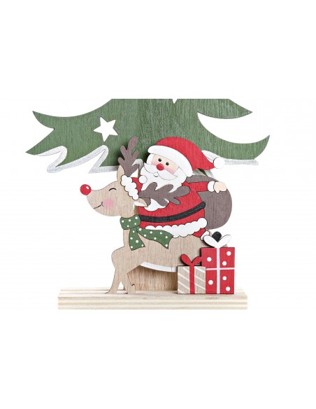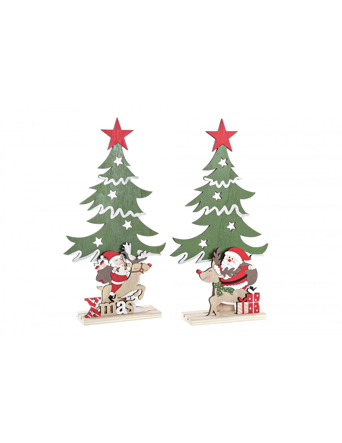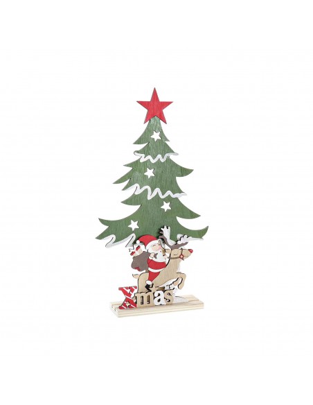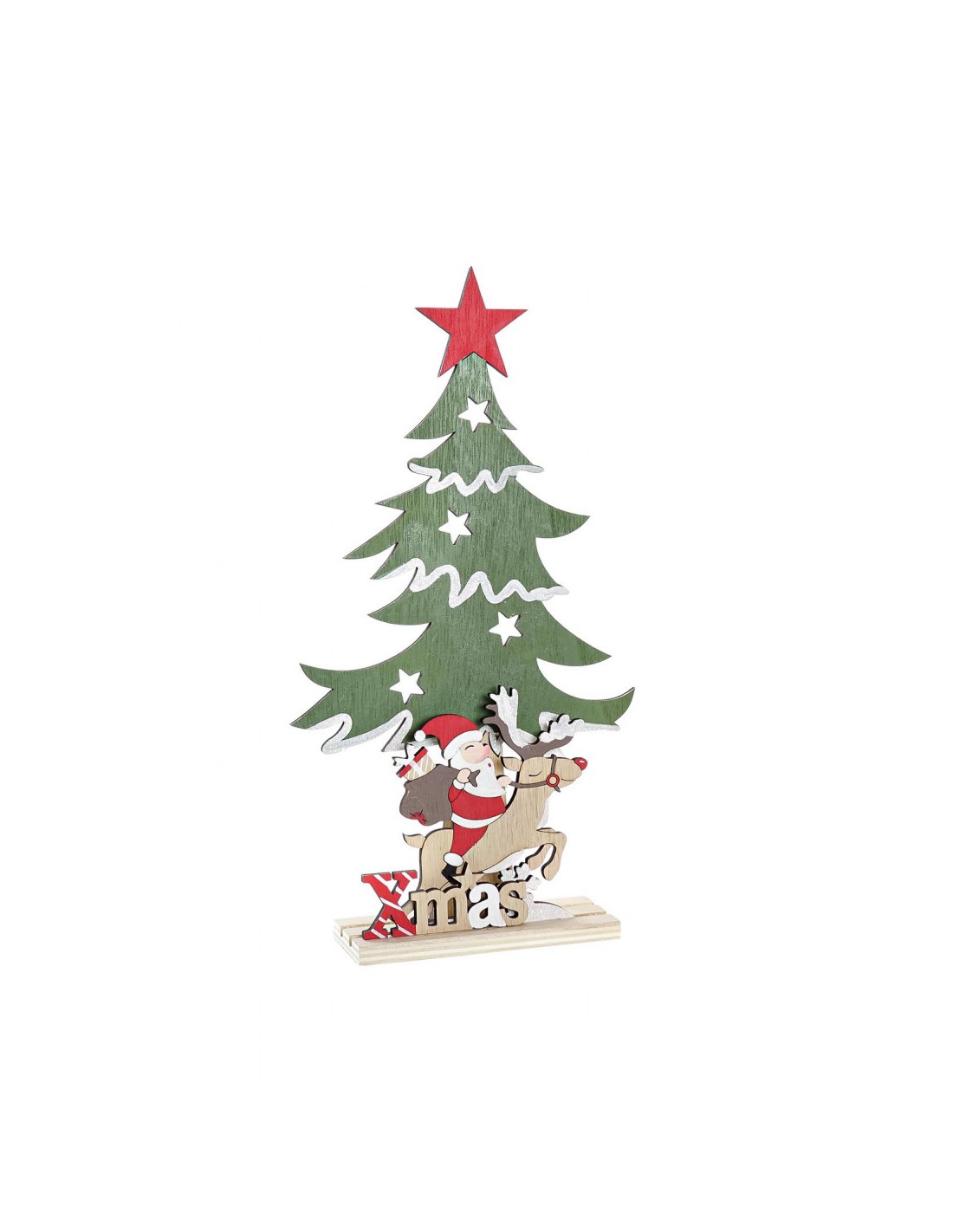 Decoración navideña de madera mdf en forma de árbol con estrella, estrellas caladas y escena de Papá Noel con reno y regalos en la base.