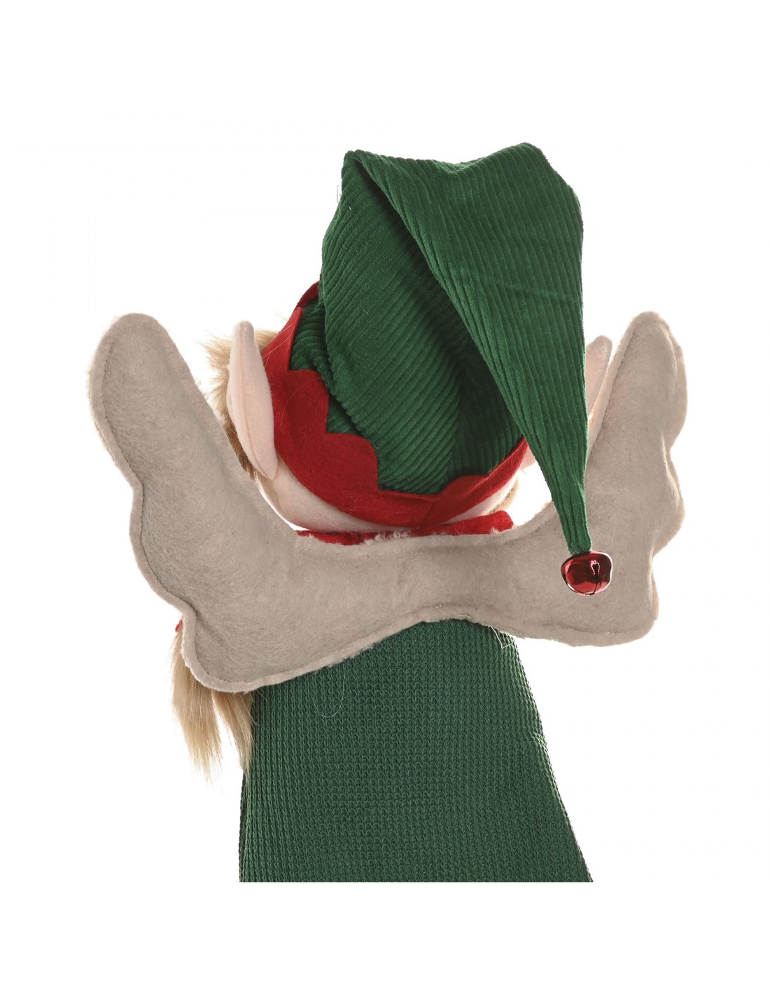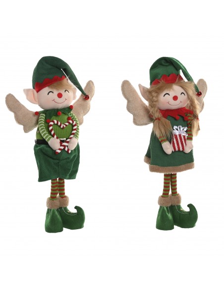 Muñeco decorativo con alas, orejas puntiagudas y vestimenta navideña en tonos verdes y rojos, con detalles de bastón de caramelo o regalo.