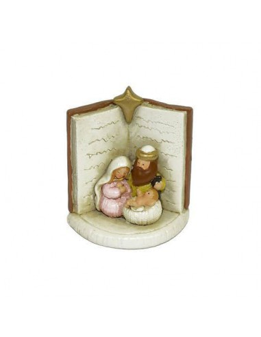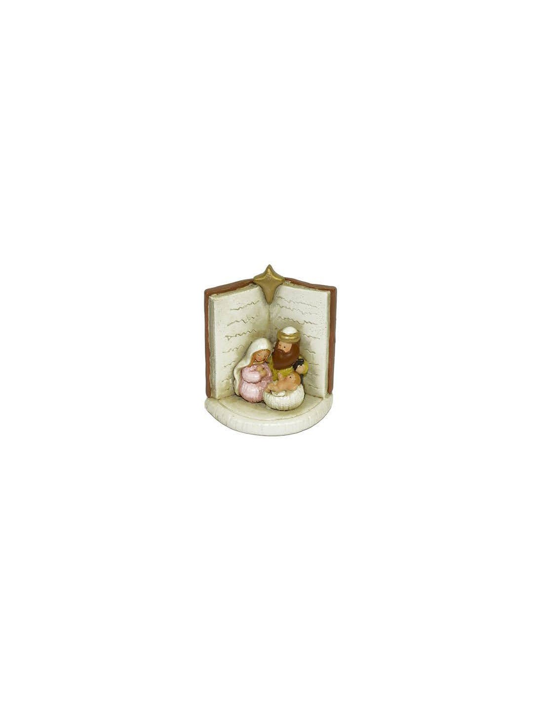 Encantadora figura de nacimiento con fondo en forma de libro abierto y estrella dorada en la parte superior.