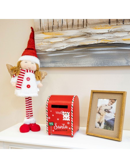 Figura decorativa en forma de ángel con ropa navideña en tonos rojos y blancos.