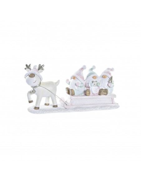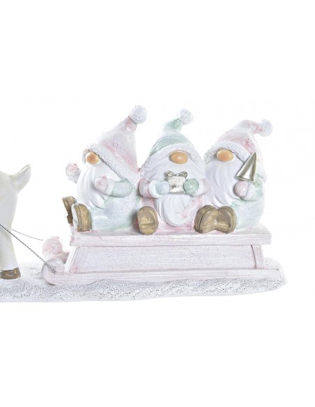 Figura navideña de resina con acabado escarchado, compuesta por un reno tirando de un trineo con tres duendes en tonos pastel y detalles brillantes.