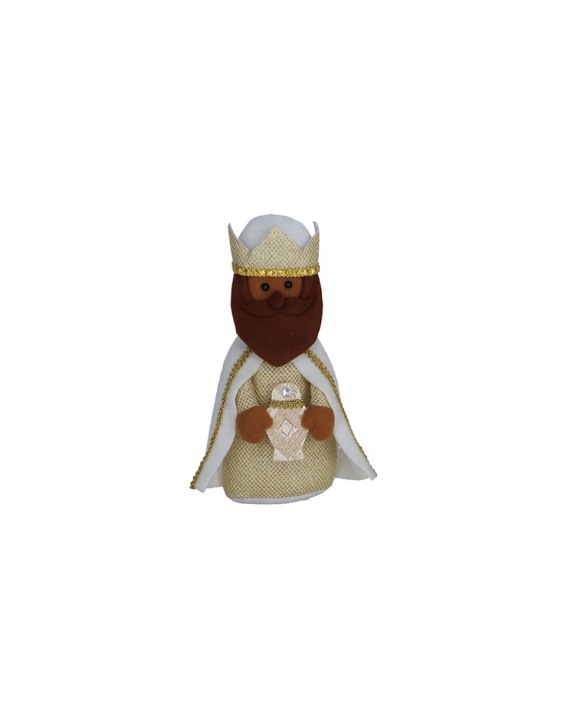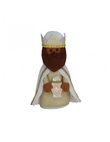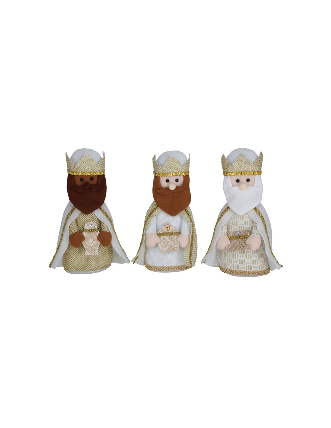 Bonita figura decorativa de los Reyes Magos elaborada en tela con detalles dorados, capas con brillo y coronas realzadas con cintas doradas.