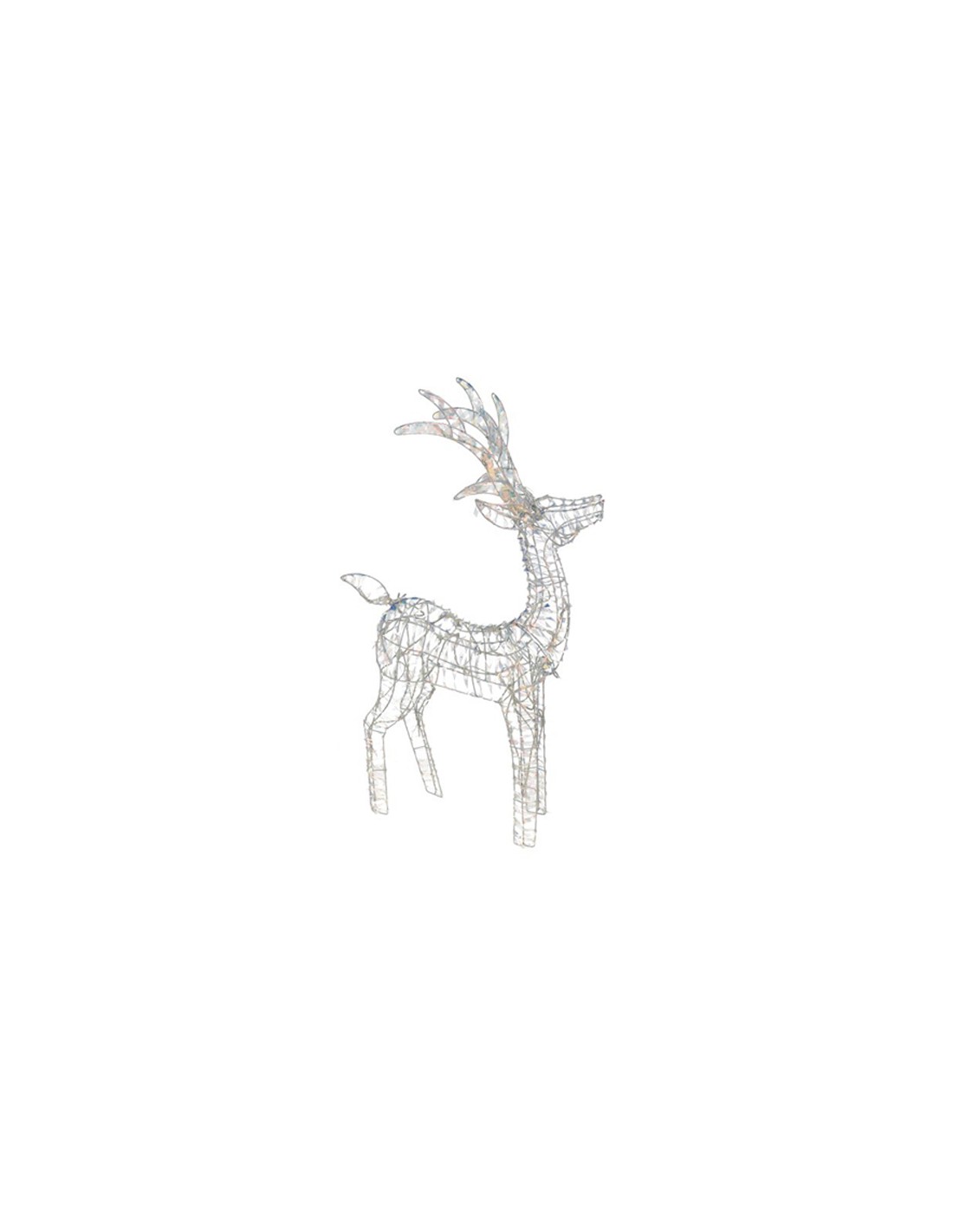 Elegante reno decorativo con estructura metálica y acabado iridiscente que refleja la luz con un efecto brillante y festivo.