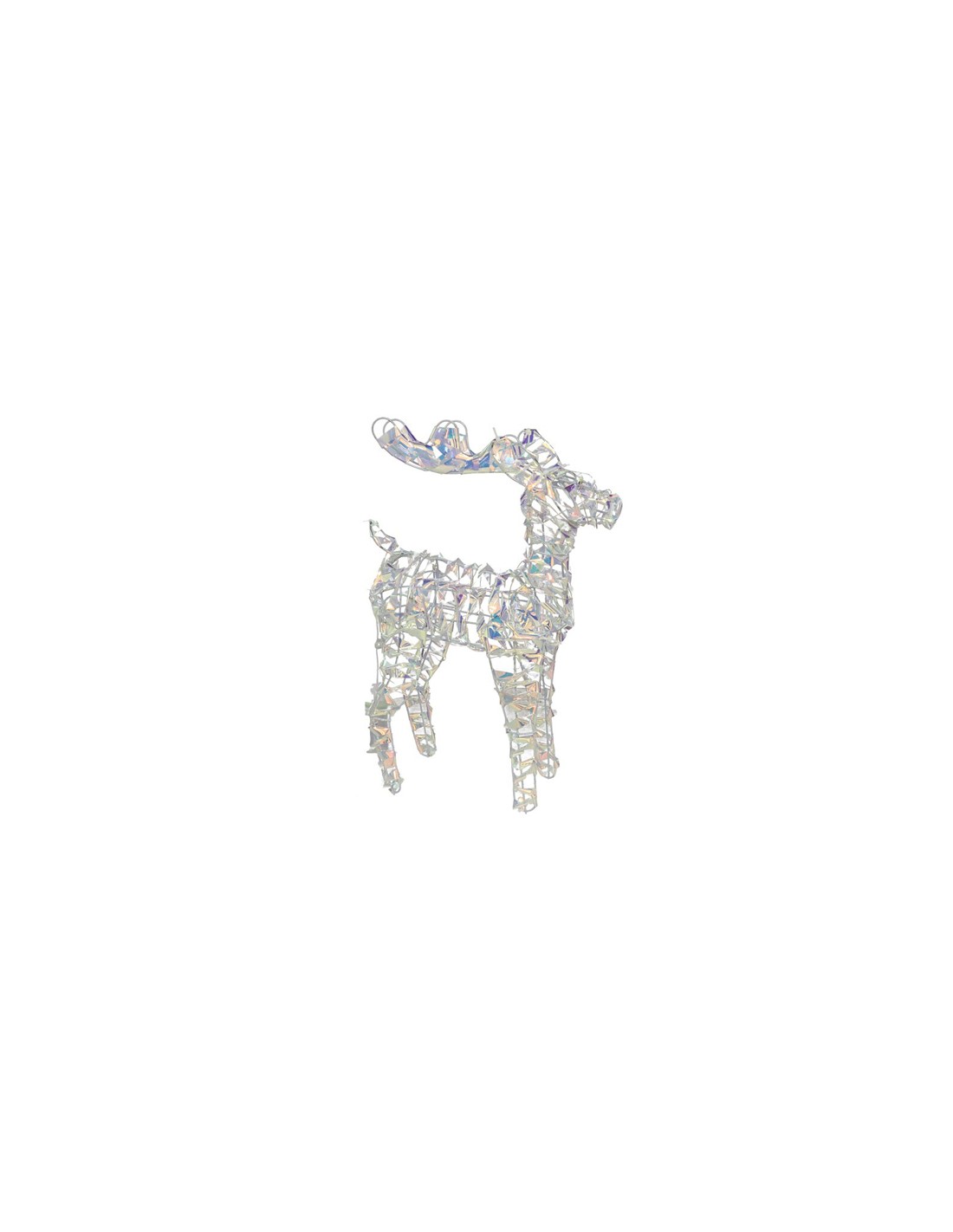 Figura navideña con forma de reno realizada en material iridiscente y estructura ligera, incluye luz LED para un efecto brillante y festivo ideal para interiores.