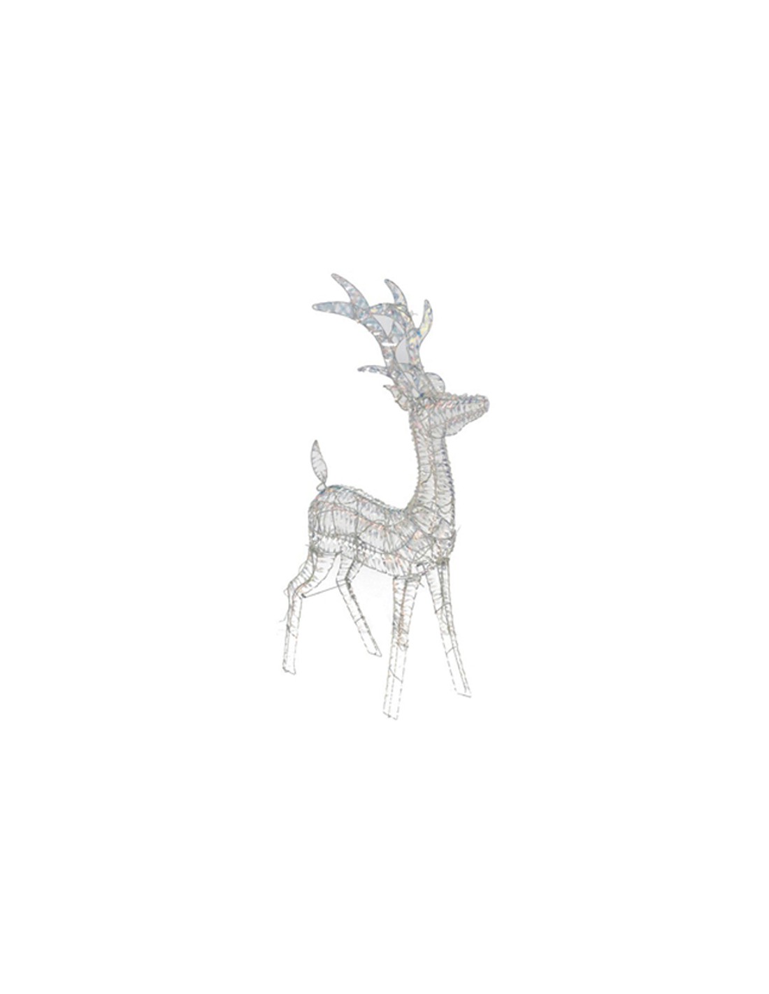 Elegante reno decorativo con estructura metálica y acabado iridiscente que refleja la luz con un efecto brillante y festivo.