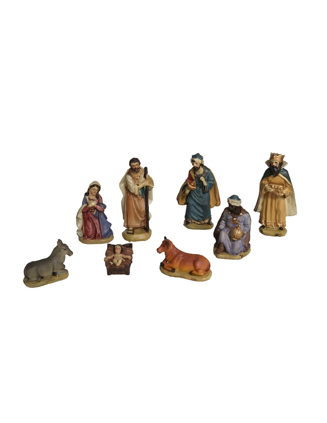 Incluye José, María, el niño, los tres Reyes Magos, el buey y la mula.