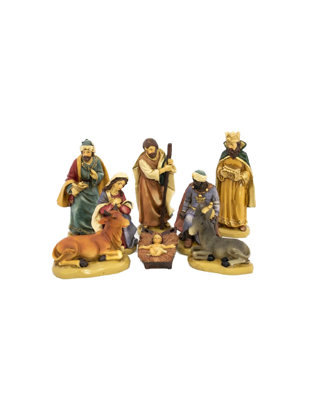 Incluye José, María, el niño, los tres Reyes Magos, el buey y la mula.