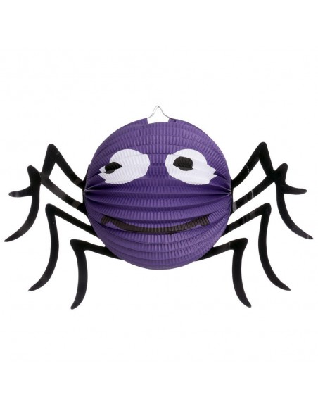 Divertido farol de papel con forma de araña en color morado con patas en negro.