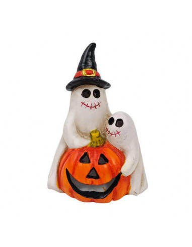Simpática figura decorativa con dos fantasmas abrazando una calabaza, uno de ellos con sombrero de bruja.