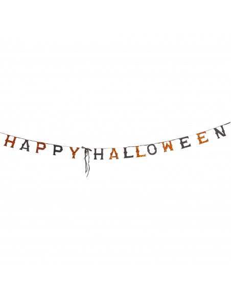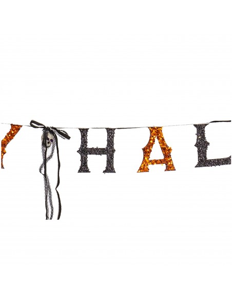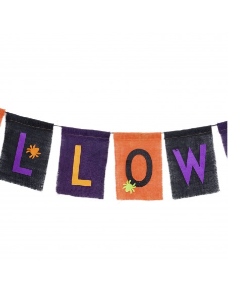 Guirnalda de tela con cuerda negra con la palabra ¨Halloween¨ en inglés, intercalando cada letra de un color y decorada con arañas.