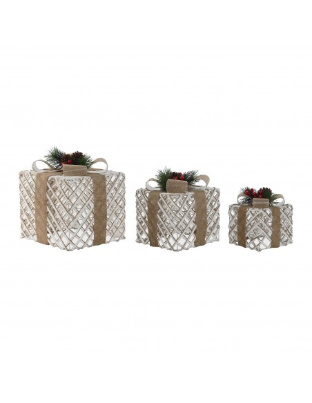 Caja de regalo navideño decorativo, con una estructura metálica interior que está forrada con tiras trenzadas de fibra natural y de cuerda blanca, todo ello con purpurina.
